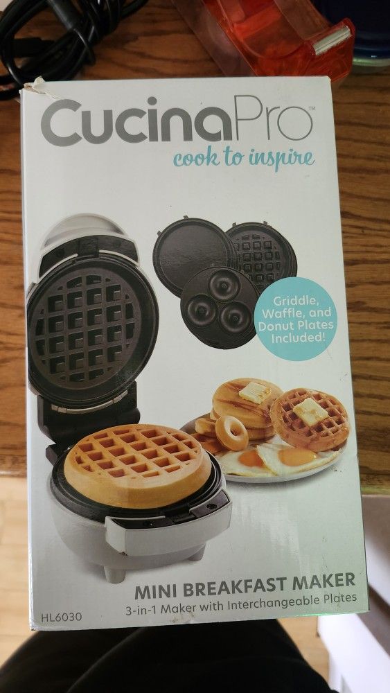 Brand new in the box never opened or used comes with all added accessories can make waffles pancakes and donuts.