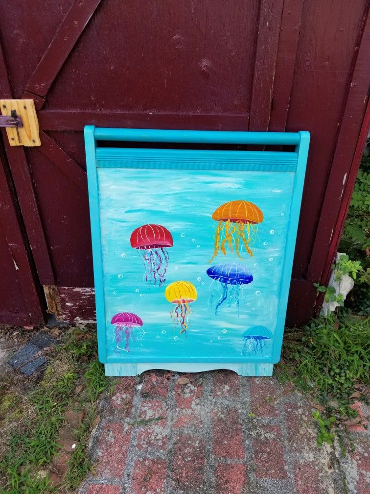 I upcycled a vintage wood baby crib and made it colorful and fun. Measures 30 wide 40 long. Protected with varnish. Would look great in a beach house or kids room. Pickup Point Pleasant borough