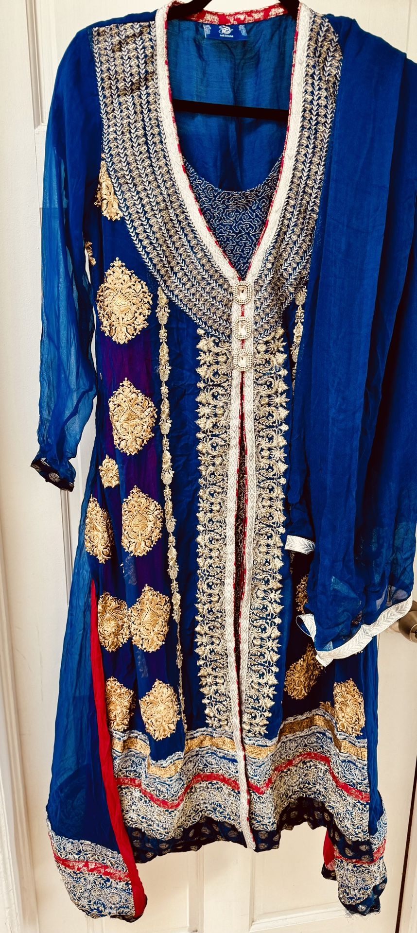 Very gorgeous, all over heavy embroidery in fine chiffon. Back has work as well as shown in pictures. Beautiful high low concept for the dress design. Inside has layers and work as well. Perfect for any party or occasions! Comes with matching dupatta and pant. Size medium. Chest 18.5 inches and length 47 inches. Original price $250