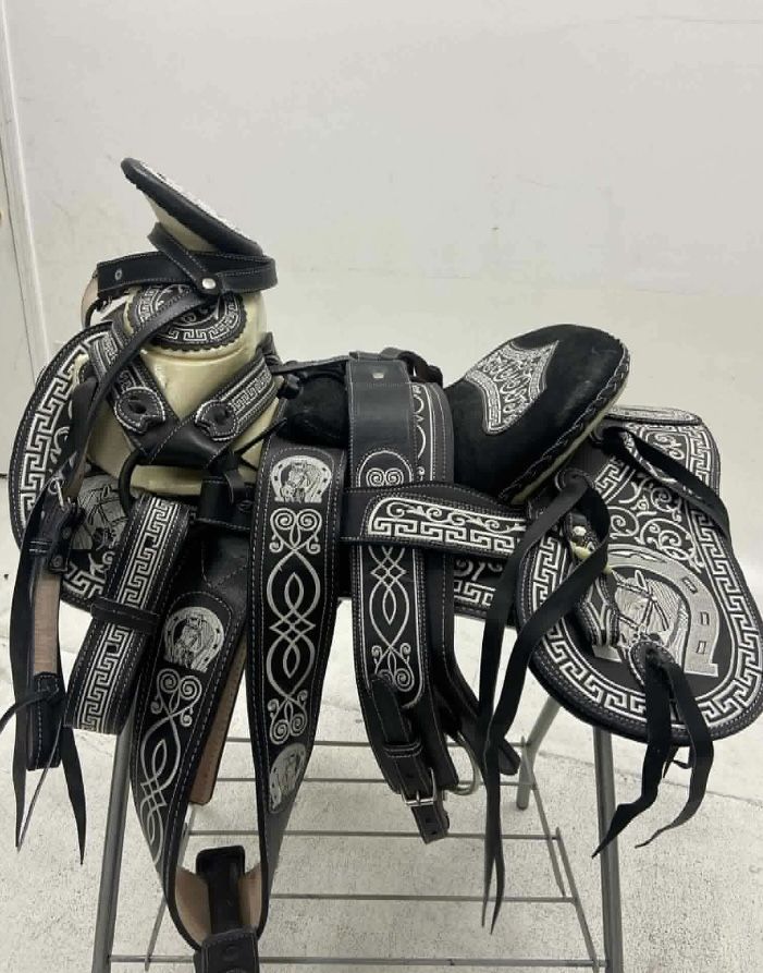 Hecha en México, 100% piel bordada con preciosos diseños charros exclusivos en toda la montura, el precio ya incluye la cabezada las correas para las espuelas, el cincho y la pechera, lista para recoger o entregamos a domicilio