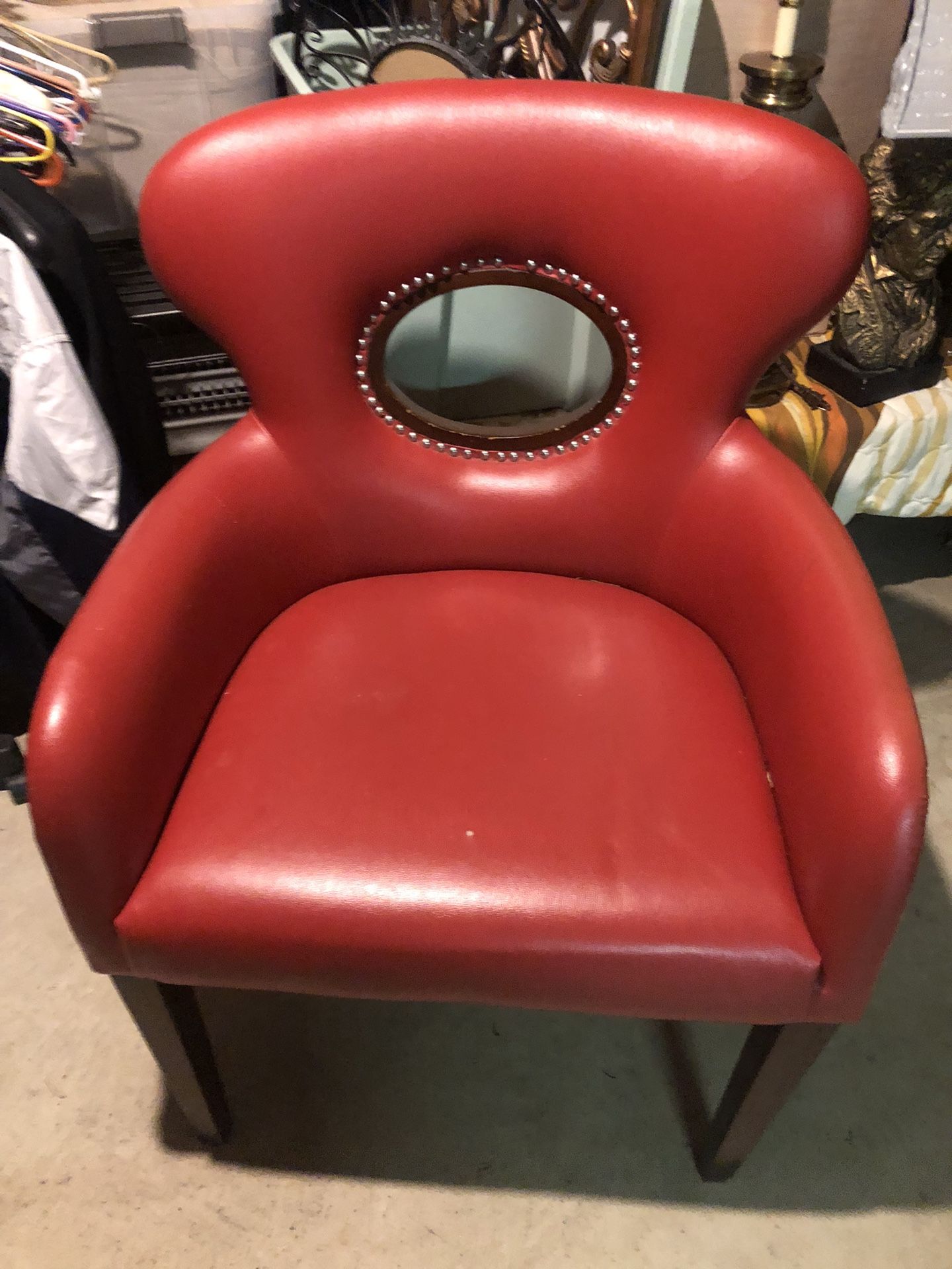 A comfy armchair in red faux leather. Can be used in any room as an accent chair.