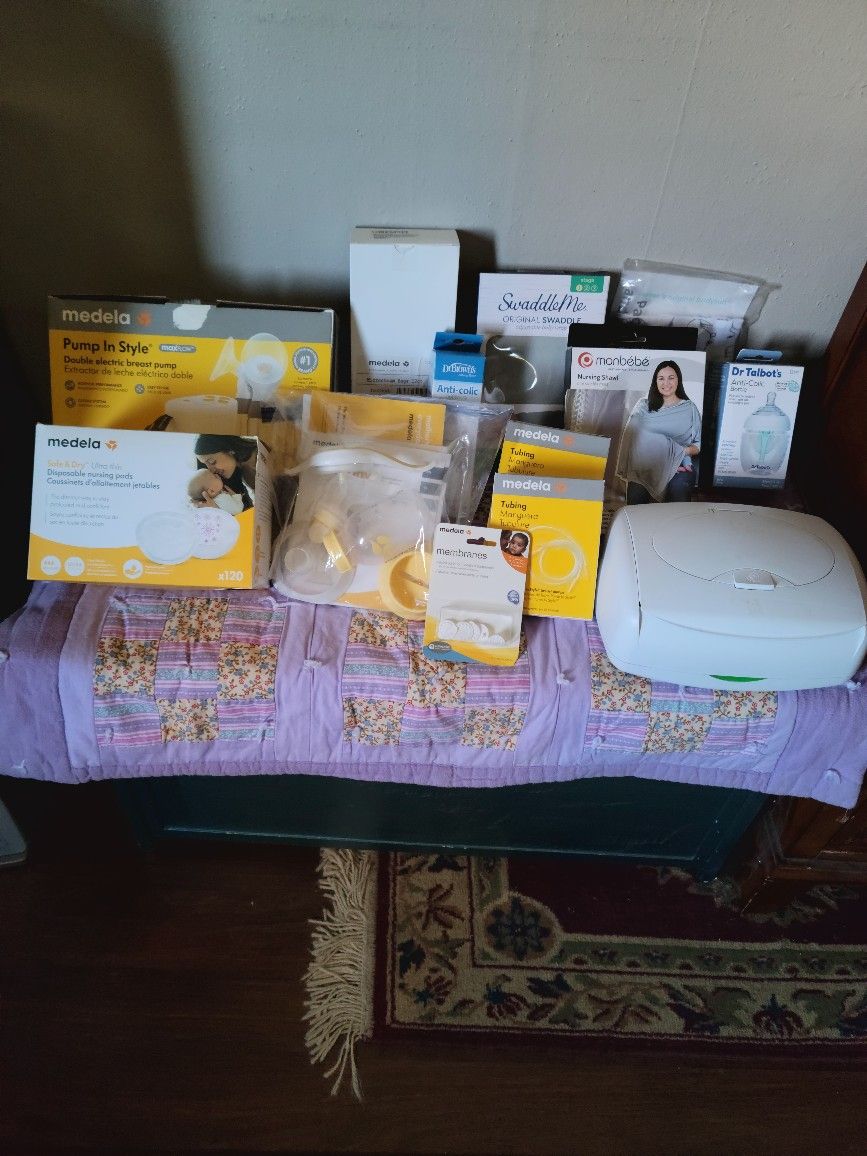 1 Medela electric pump with attachments and bottles (open box) 1 Medela manual pump with attachments and bottle (opened, in bag) 1 new pack of 6 Medela membranes 1 new box of 12 Medela steam bags 1 new box of 120 Medela disposable pads 2 new boxes of Medela tubing 1 new Monbebe nursing shawl 2 new baby bottles 1 wipe warmer (used, good condition) 1 new swaddle 1 new animal print onesie. Aside from wipe warmer, I never got to use any of it. *Check out my other listings and get it all for $300
