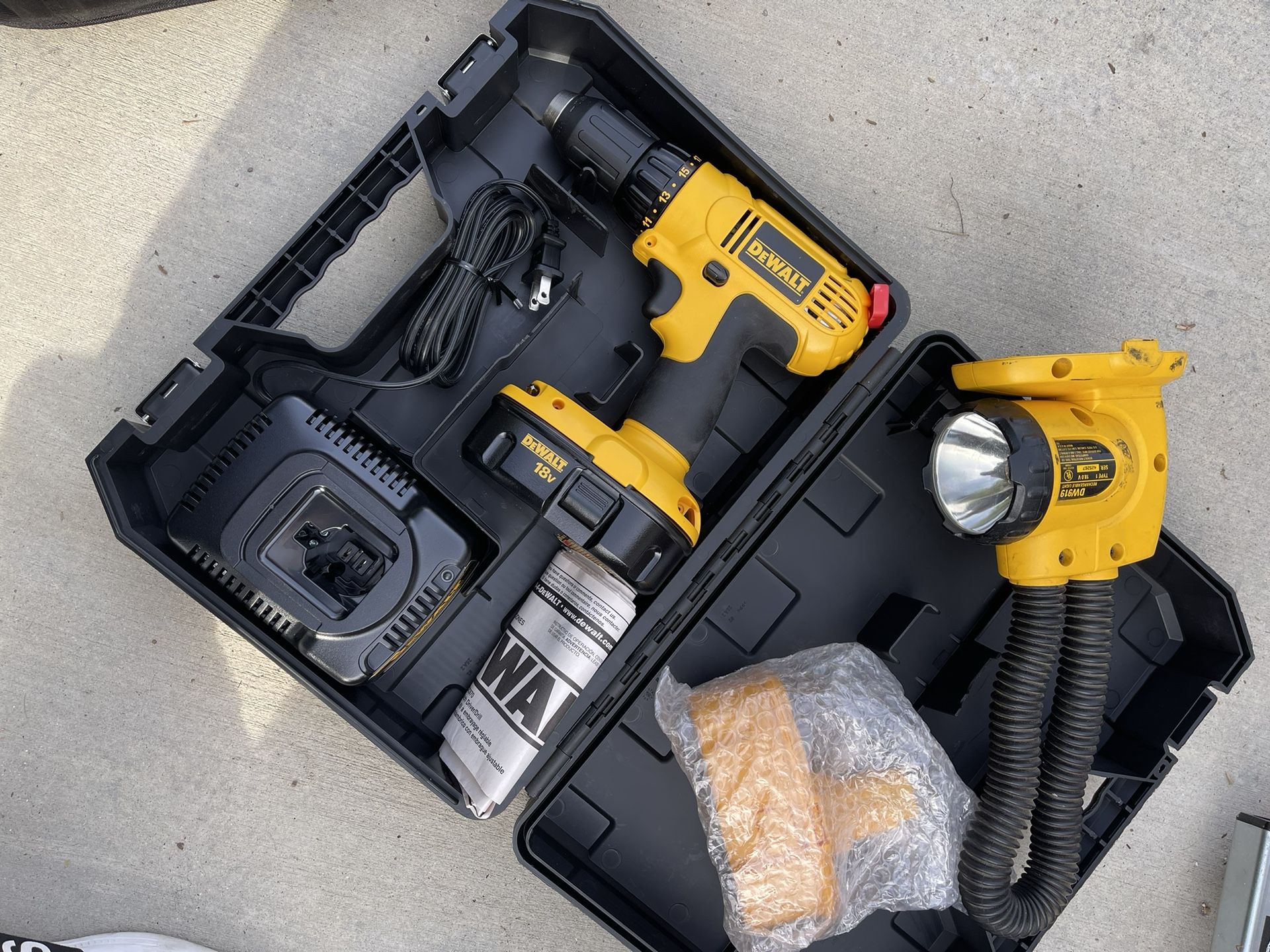 Dewalt 18v drill and light with hard case, 3 batteries and charger (one battery not shown but included)