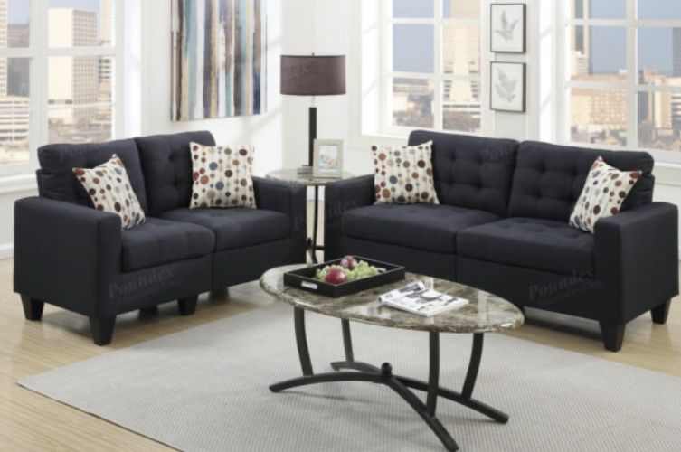 Sofa & Love Seat Item # F6903 Color: Black Accent Pillows Included Linen-like Cushioned Fabric Asymmetric Tufting Light Accent Stitching Available in Blue Grey, Sand, Black, and Light Coffee Materials: Polyfiber Plywood + Solid Pine Foam, Fiber Battings Dimensions: Love Seat 58″ x 32″ x 36″ H 2-seat sofa 71″ x 32″ x 36″ H Some Assembly Required