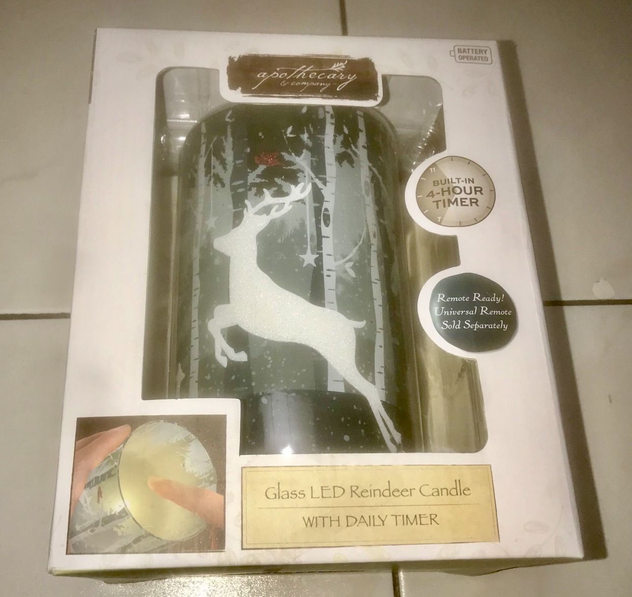Brand new in box. Glass LED Reindeer candle with timer. Retail price $29.99.