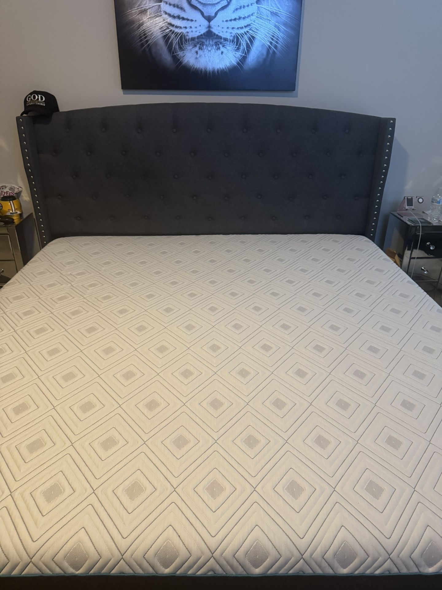 King size bed with mattress included. Mattress is less than a year old. No stains, no flaws always kept covered. All slacks, screws included. Mattress is Sealy 12” memory foam. Pick up in Chesapeake Va. 23323 area.