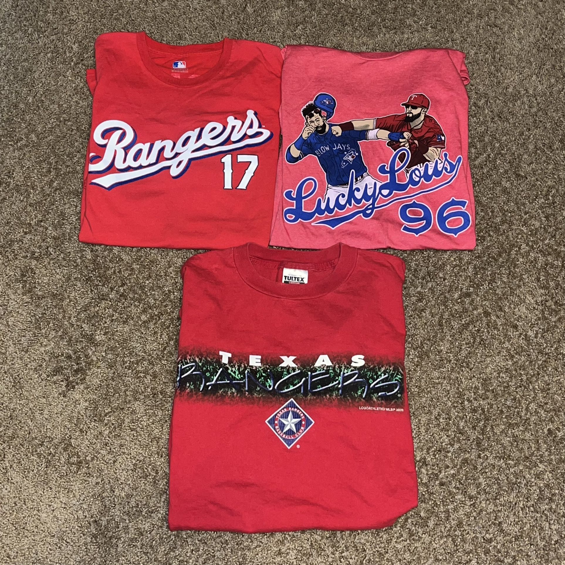 All these shirts are a size large. 1 new school, 2013 Cruz, 2000 Texas Rangers shirt