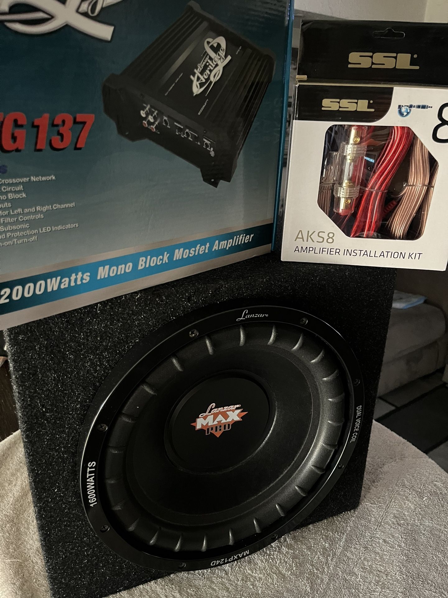 New Lanzar Max Pro 12โ 250 watts Dual 4 Ohm Subwoofer ๐Sealed sub box โข Enclosure Dimensions Sub cut out: 11.125", mounting depth: 8", Height: 13", Width: 15.25". Lanzar 1-channel 2000 watts amplifier. 8-gauge amplifier installation kit. I do not install. Pick up only.