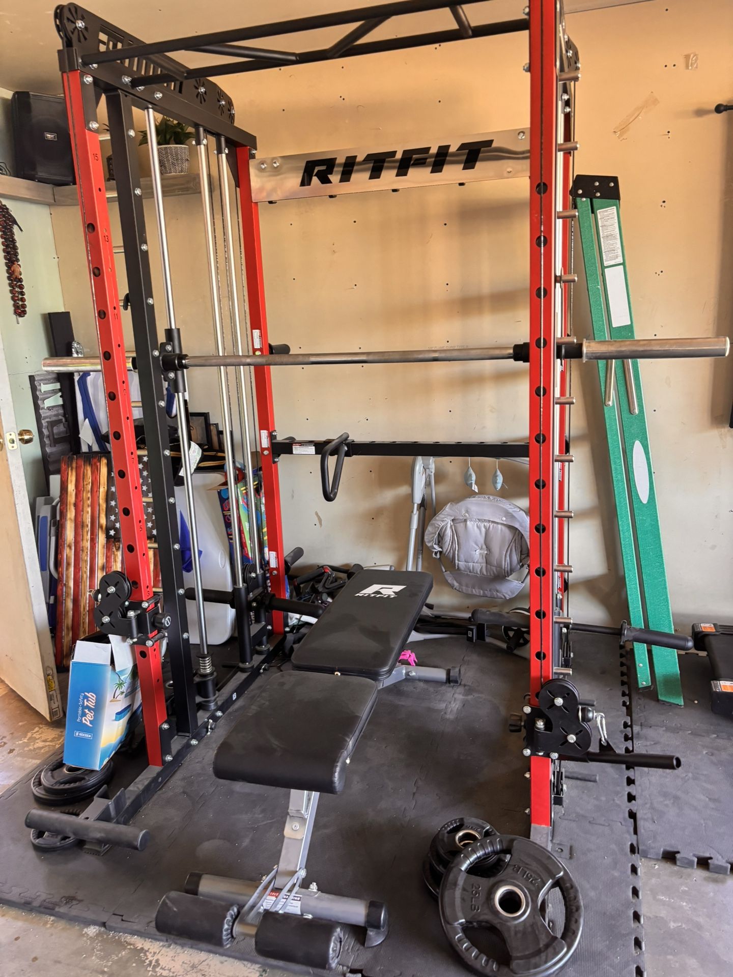RitFit M1 & M1 Pro Smith Machine with Cable Crossover System, Multi-Function Squat Rack Power Cage for Home Gym, Power Rack and Packages INCLUDES BENCH AND WEIGHTS EXTRA !!!!! 2x 25 2x10 2x5 2x2.5 pounds SERIOUS BUYERS ONLY CUZ NEED TO TAKE IT A PART TO PICK UP!!!!