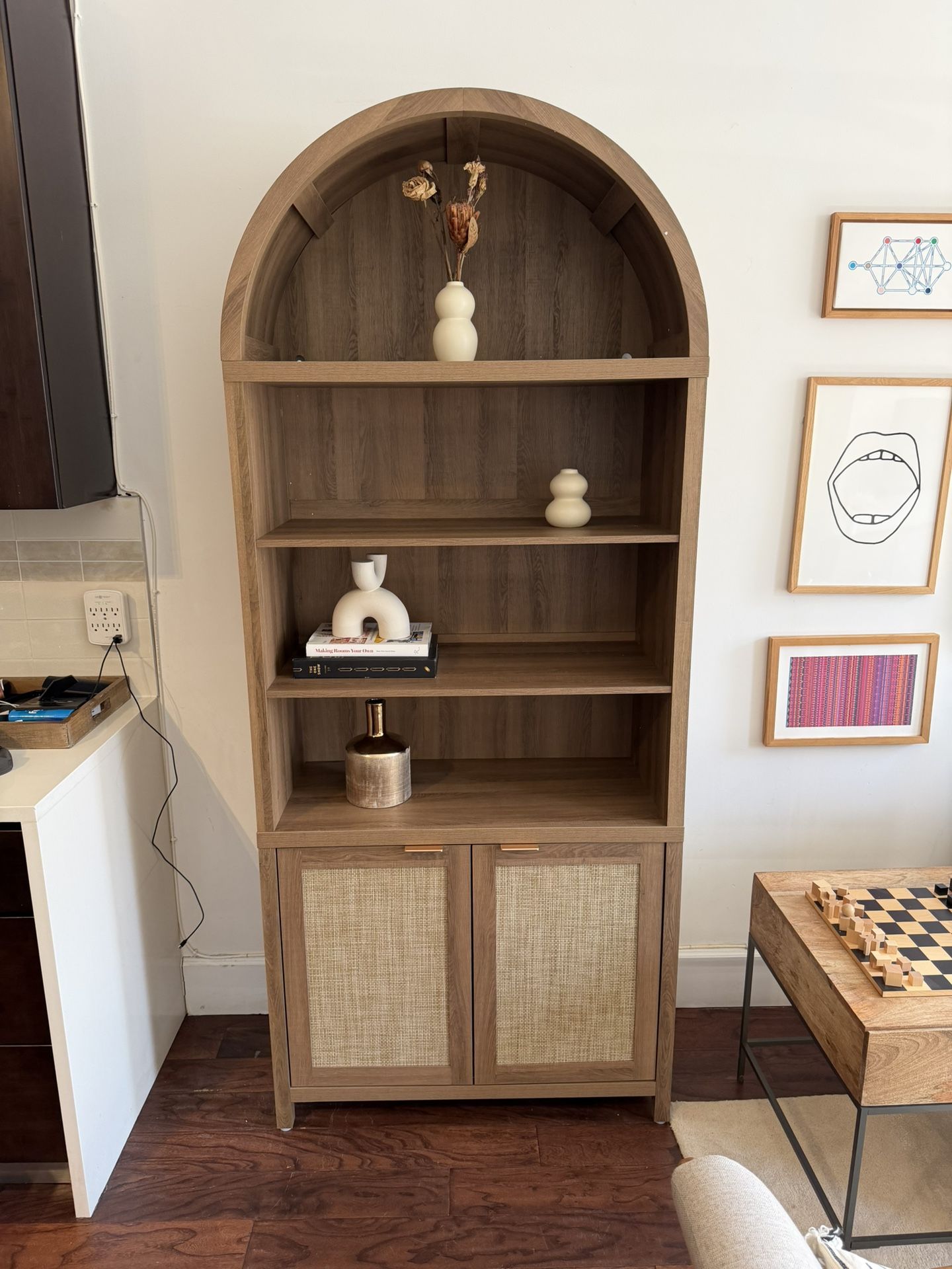 Brand New 84.2" Tall Bookcase 5 Tier Large Bookshelf with Doors Storage Selling because it's doesn't fit the space - otherwise it's a gorgeous piece! Material: Engineered Wood Shelf Type: Engineered Wood Number of Shelves: 5 Special Feature: Arched Top, Adjustable Shelves, Hidden Handle, Rattan Style Product Dimensions: 16.1"D x 35.5"W x 84.2"H