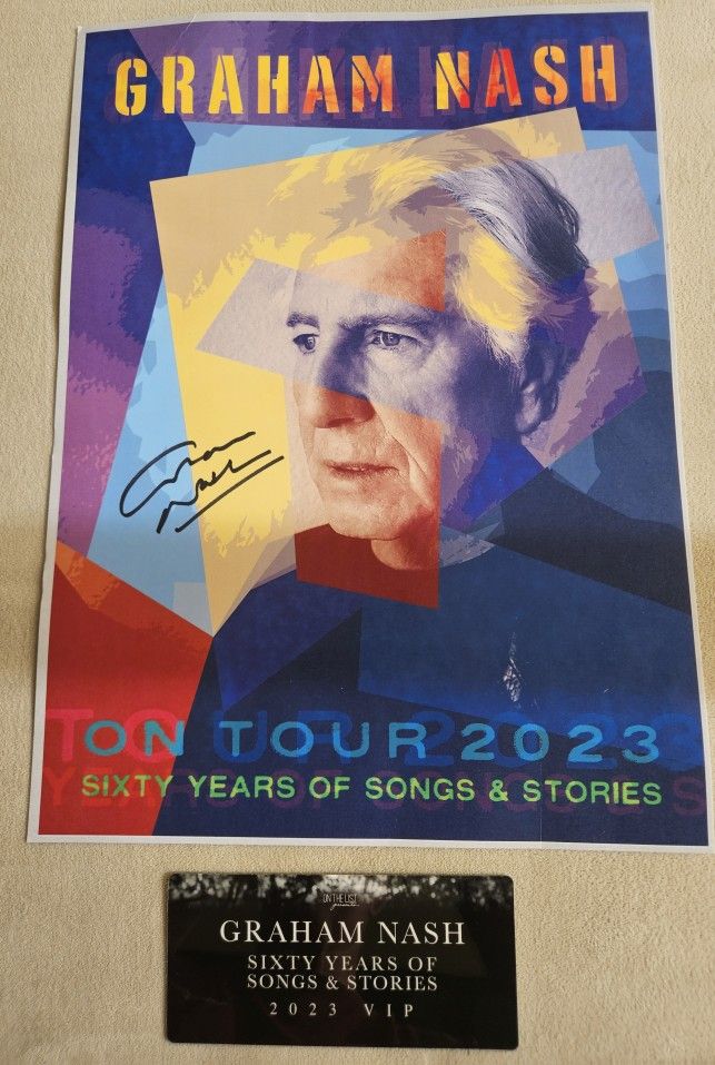 This image shows memorabilia from Graham Nash's 2023 "Sixty Years of Songs & Stories" tour, which celebrated his legendary career as a founding member of The Hollies and Crosby, Stills & Nash. The set includes an autographed tour poster and a VIP commemorative pass, both featuring an artistic portrait of Nash. The pass in the image indicates it was part of a special VIP Experience. Depending on the tier, these packages typically included: 11" x 15' Graham Nash Sixty Years of Songs & Stories Tour 2023, VIP Poster/Print. Sianature is from print, reproduction. Matte finish.