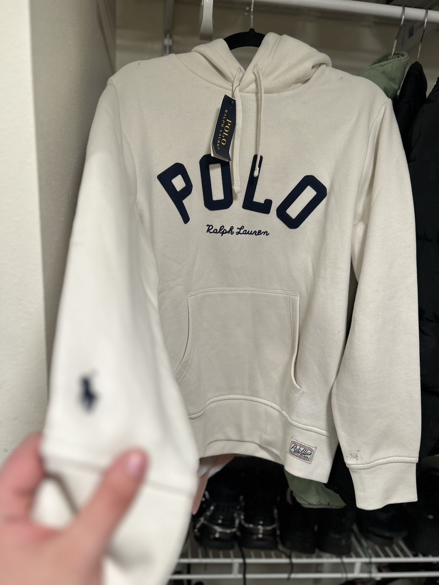New With Tags Men’s Off White Polo Ralph Laren Pull Over Drawstring Hoodie With Black Polo Logo on front and large front pocket. Men’s Small Tag Price $168