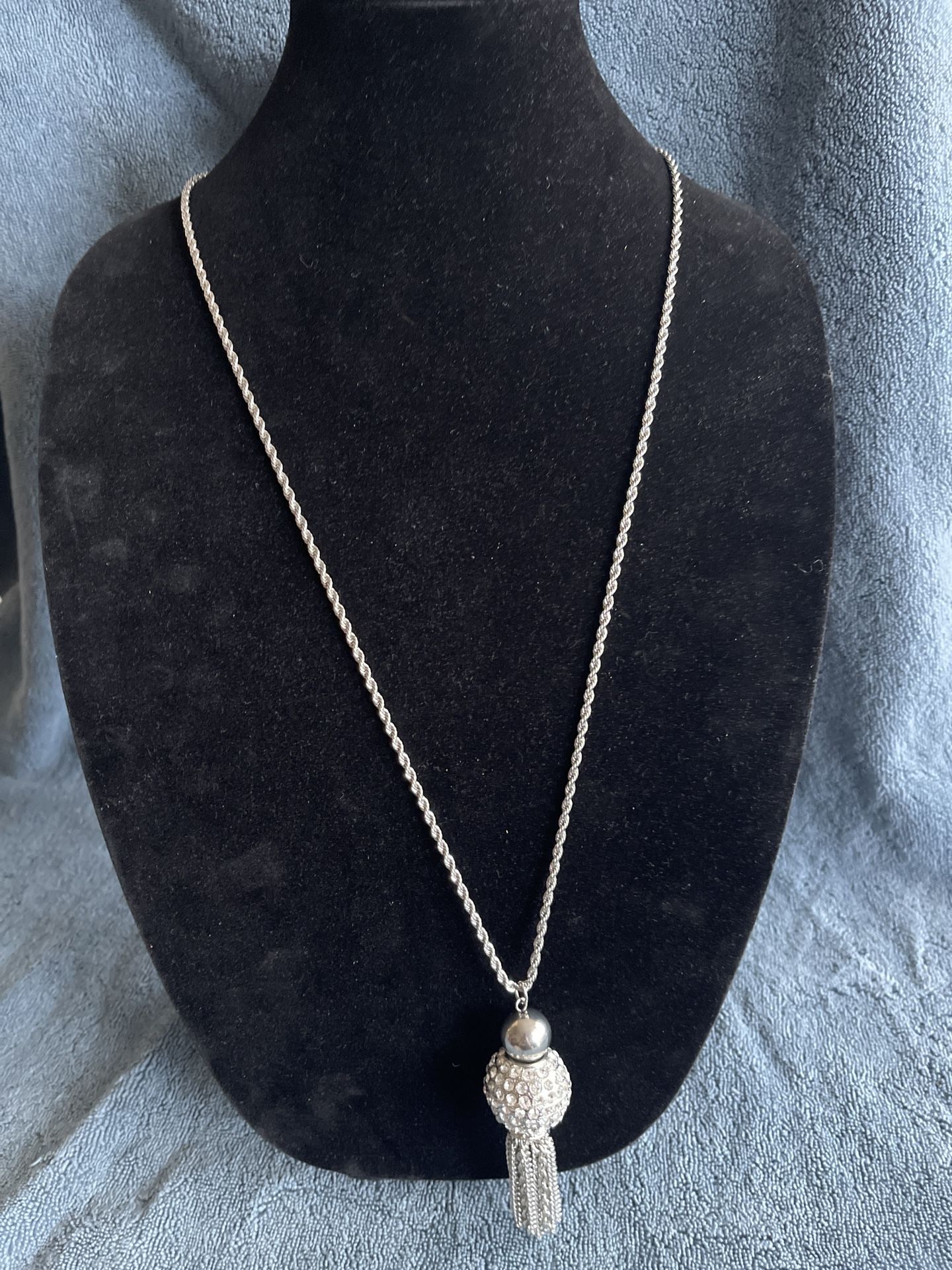 Elegant silver-tone necklace with a twisted chain and decorative pendant. Features a rhinestone-encrusted ball with a cascading metal tassel. Perfect for evening wear, special occasions, or as a bold statement accessory. Adds sparkle and sophistication to any outfit.