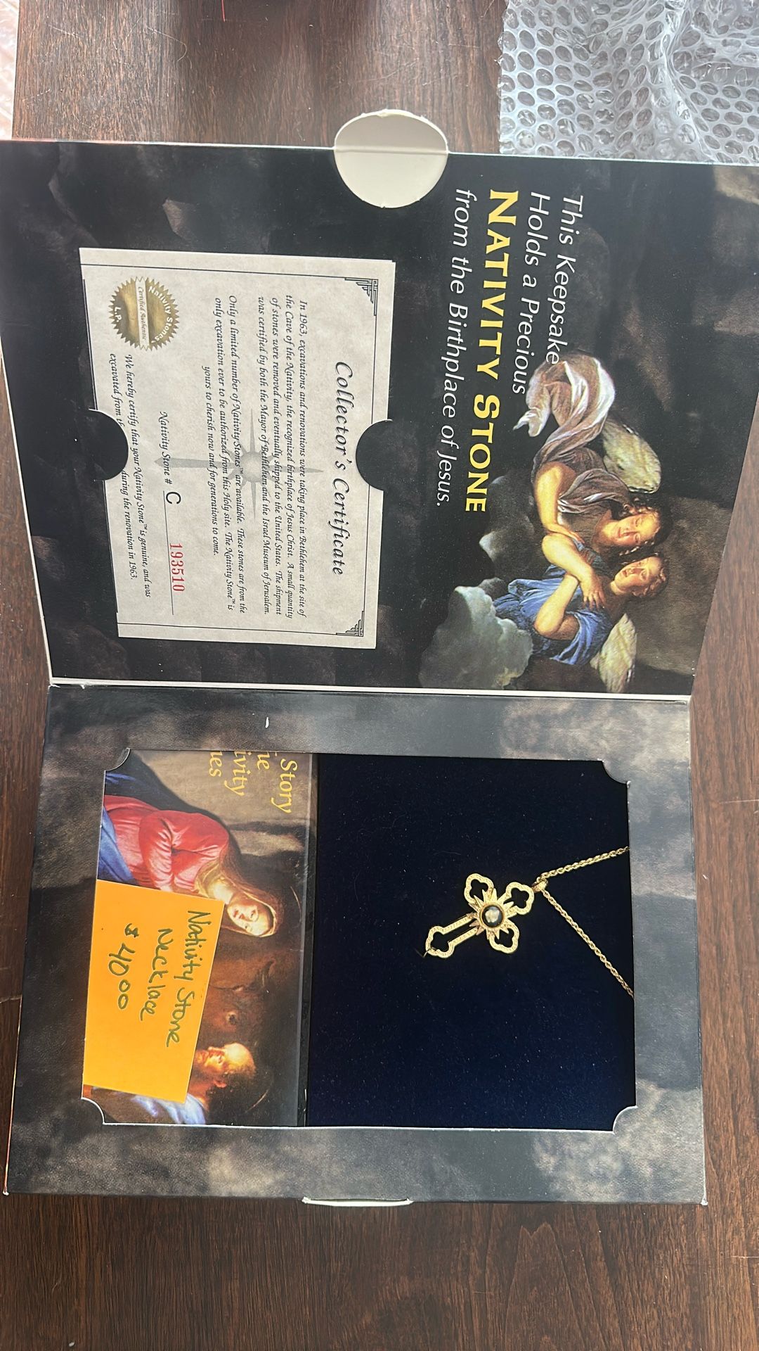This is a nativity stone necklace still in its original packaging with a collectors certificate asking price is $40, cash preferred.