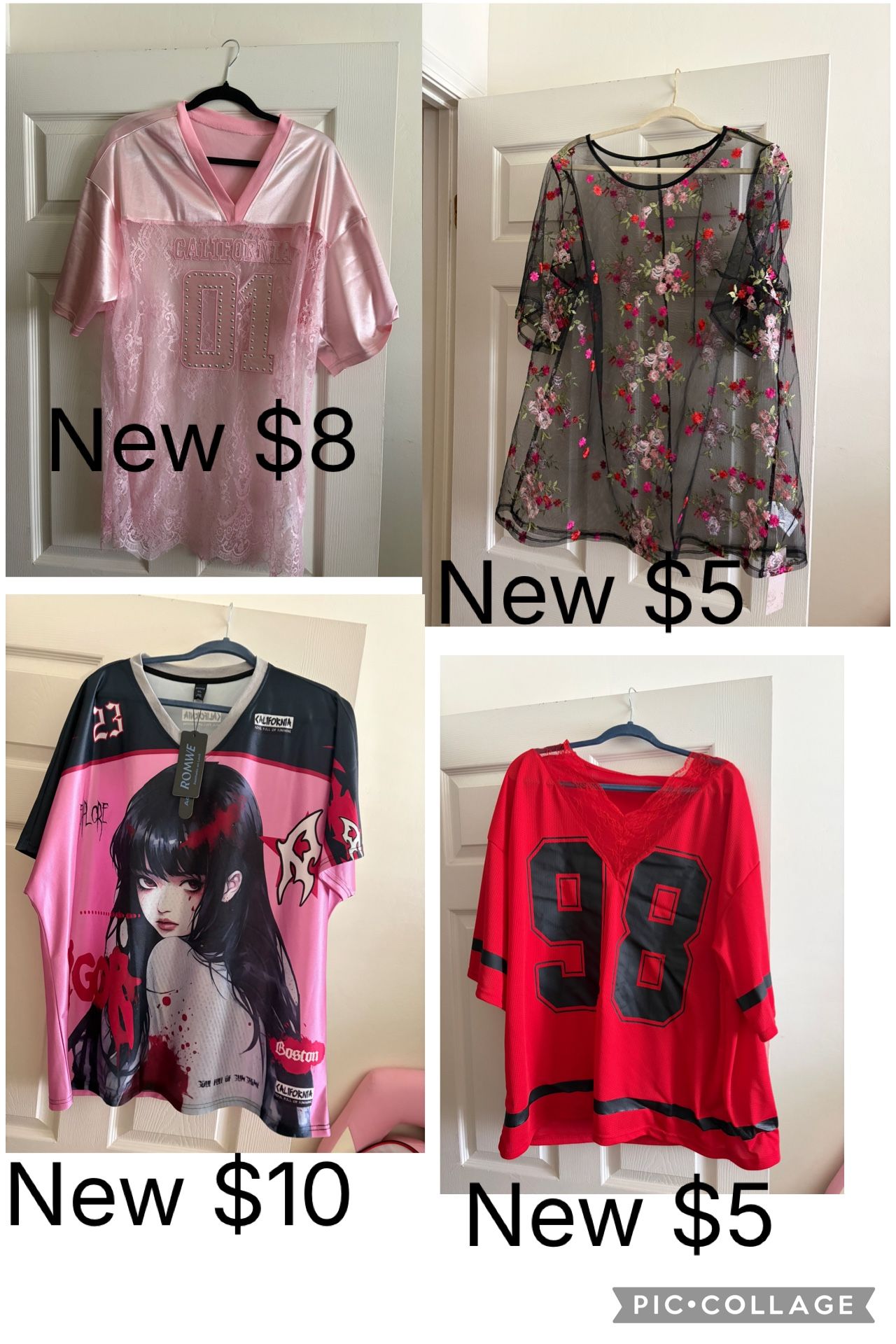 Pink shirt 1X Sheer floral top 1x Anime shirt 1x Red top 1x All $3 each