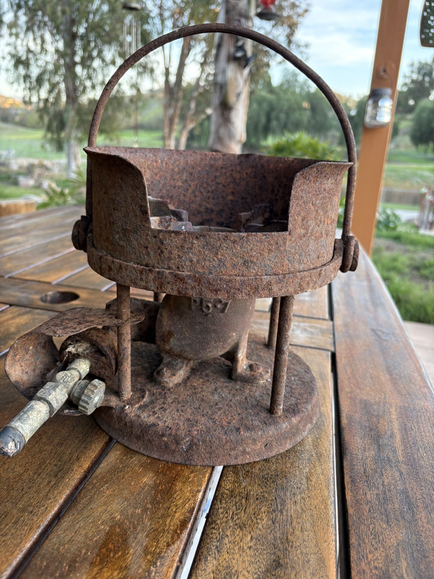 This is from the 1930s to 1940s. Plumbers would put copper or lead in a pot that went with this burner. I don’t have the pot for it. Great shelf or yard art. Can be used as a plant stand or any other creative idea.
