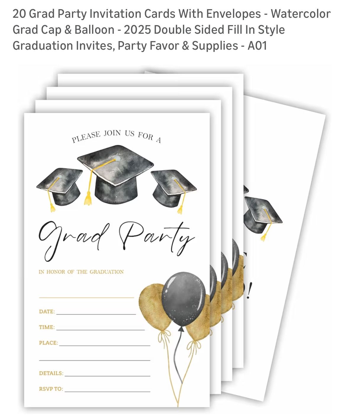20 Grad Party Invitation Cards With Envelopes - Watercolor Grad Cap & Balloon - 2025 Double Sided Fill In Style Graduation Invites, Party Favor & Supplies - A01 B-9