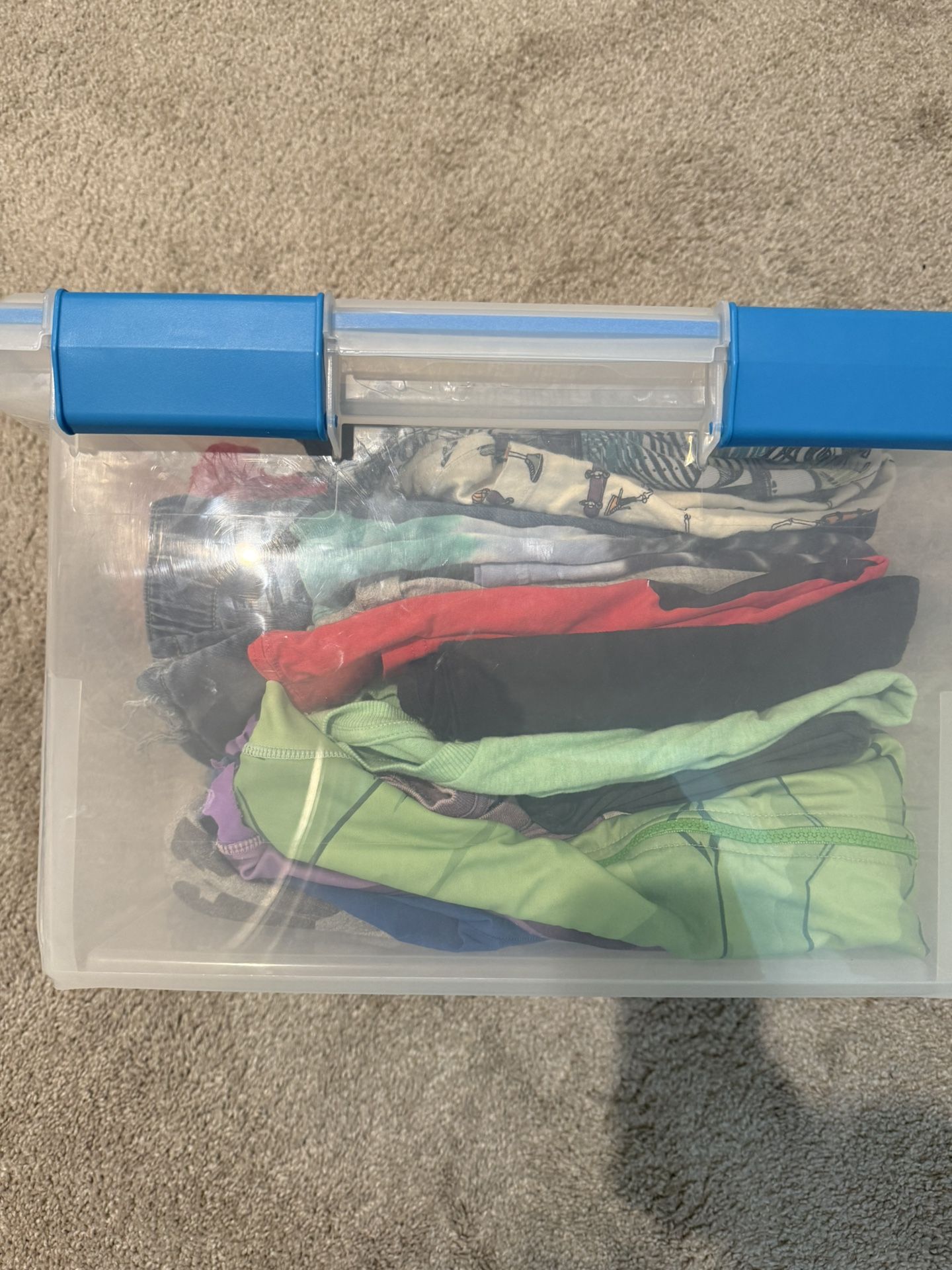 The following are inside this bin Bin not included in purchase Size 7/8 sweatpants Size 8 Hannah Anderson Pokemon pj set Size 7/8 joggers Hulk swimsuit 7/8 Size 8 Levi’s pull on pants Size medium Spider-Man t shirt Size 6/7 shorts Size 8 tank top Qty 4- Size medium t shirt Size small t shirt Size 8 cat & jack jeans Size 7/8 Disney Star Wars sweatshirt Size 8 Spider-Man sweatshirt Size medium long sleeve Disney shirt Available for pickup in Ontario ranch