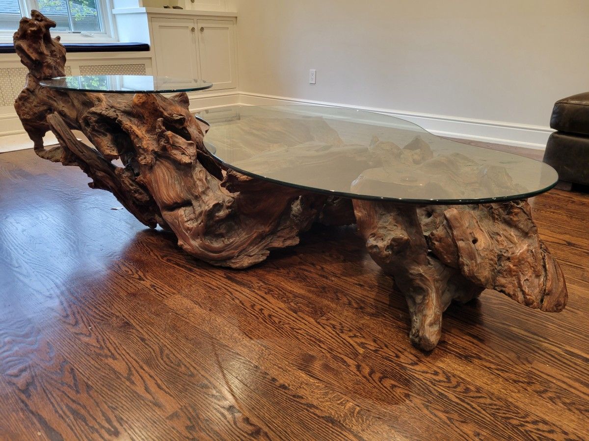 Live Burl Natural Stump Two Tiered Glass Top Coffee Table, RARE find, Artisan piece