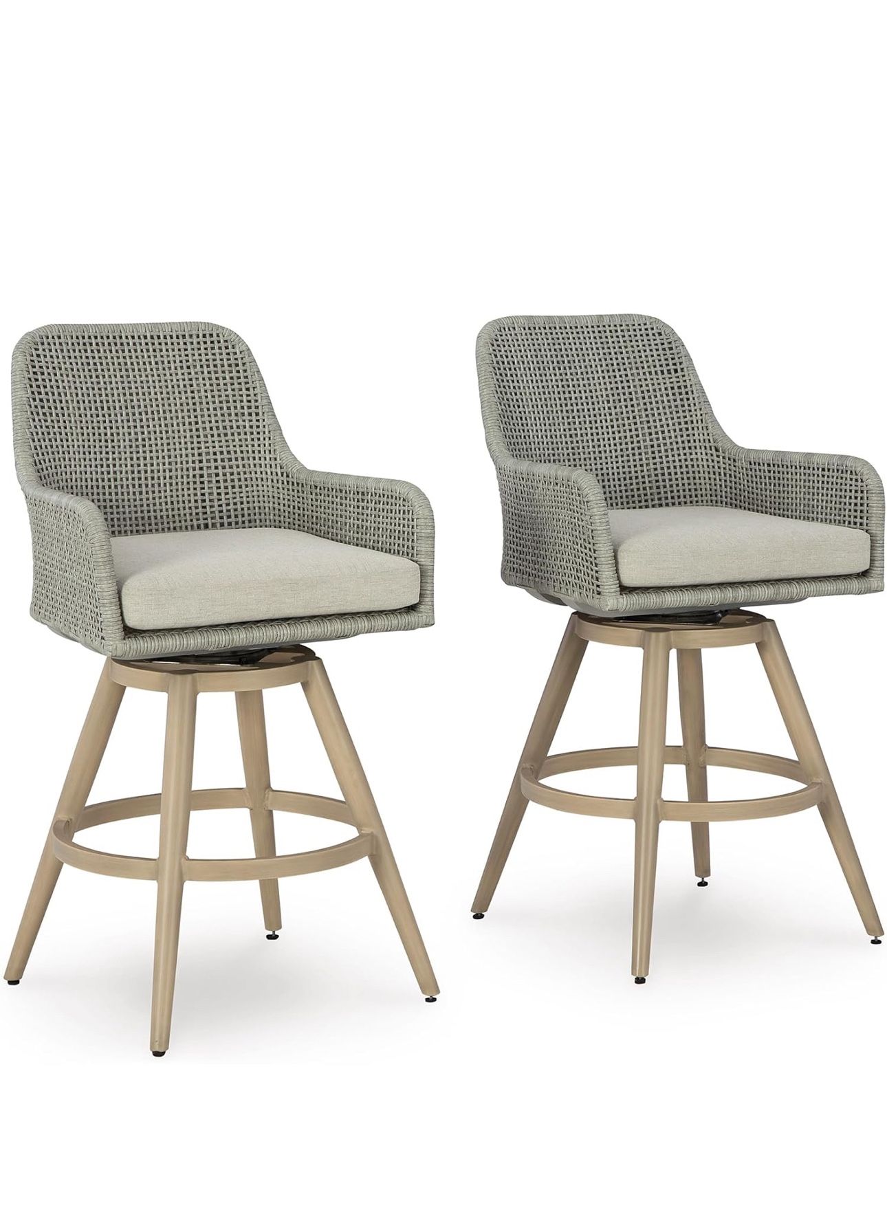 Signature Design by Ashley Seton Creek Casual Nuvella Weather Resistant Fabric, Resin Wicker Swivel Outdoor Bar Height Bar Stool with Cushion, Footrest and Armrest, Set of 2, Beige & Light Gray See product specs on Amazon: https://offerup.com/redirect/?o=aHR0cHM6Ly9hLmNvL2QvYXYwR282Vg==