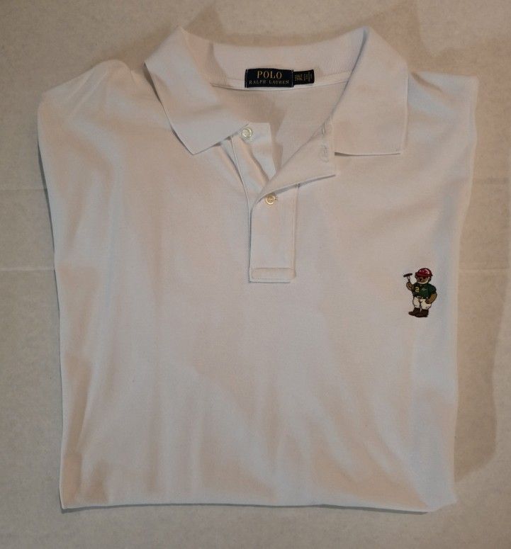 The product is a Ralph Lauren Polo Bear polo shirt in white, size 2XLT. This shirt is designed for men who are big and tall, featuring the iconic Polo Ralph Lauren Polo Bear theme. The brand is known for its high-quality and stylish clothing, making this shirt a classic and versatile addition to any wardrobe.
