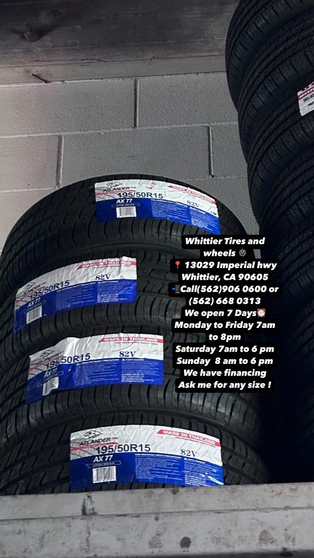 WHITTIER TIRES 13029 IMPERIAL HWY WHITTIER CA 90605 CALL (562)906-0600 TEXT (562)413-6926 - WE HAVE THE BIGGEST USED & NEW TIRE INVENTORY AVAILABLE, ASKS US FOR ANY SIZE YOU NEED. FINANCING OPTIONS AVAILABLE, 90 DAY NO INTEREST! HABLAMOS ESPAñOL. OPEN MONDAY-FRIDAY 7AM-8PM, SATURDAY 7AM-6PM, SUNDAY 8AM-5PM 185/65/14 175/65/15 185/55/15 185/65/15 195/65/15 205/55/16 215/55R16 215/60/16 205/65/16 245/75/16 265/70/16 285/75/16 265/75/16 215/45/17 225/45/17 225/50/17 215/50/17 215/55/17 235/65/17 245/65/17 255/65/17 265/70/17 285/70/17 33x12.50r17 215/45/18 225/40/18 235/40/18 235/45/18 245/45R18 235/60/18 245/60R18 265/60/18 255/70/18 265/70/18 33x12.50r18 225/40/19 235/40/19 245/40/19 245/45/19 245/35/20 245/45/20 245/50/20 255/50/20 265/50/20 275/55/20 275/60/20 33x12.50r20 35x12.50r20 37/13.50R20 265/35/22 285/45/22 305/40/22 305/45R22 33x12.50R22 295/35/34 305/35R24 ESPECIAL DE LLANTA NUEVA Y USADA GOODYEAR MICHELING BRIDGESTONE FIRESTONE CONTINENTAL ARROYO YOKOHAMA PIRELLI KUHMO TOYO ATLANDER LANDGOLDEN LANDSPIDER LLANTAS TIRES WHEELS