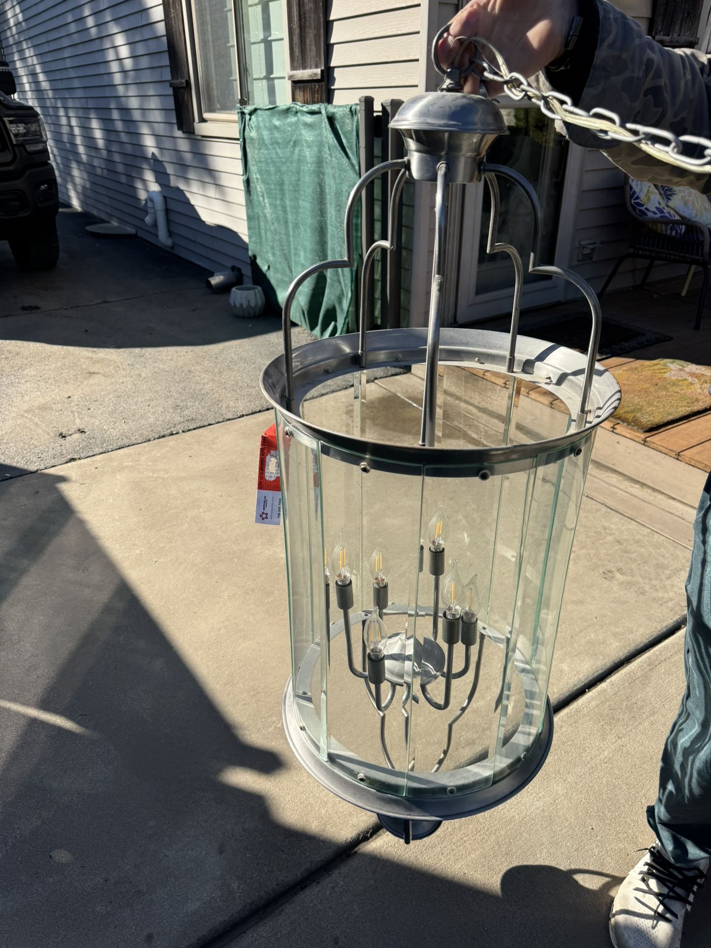 Gorgeous oversized brushed nickel chandelier with curved glass panels and six candelabra bulbs. This piece makes a statement — elegant, bright, and timeless. Perfect for a grand foyer, staircase, dining room, or vaulted ceiling space. Excellent condition and works perfectly. Features a solid metal frame with beveled glass panels and adjustable hanging chain. We only replaced it during a remodel — it’s too beautiful not to find a new home. Details: • Finish: Brushed Nickel • Dimensions: Approx. 36” tall × 16” wide • 6-light candelabra interior (E12 bulbs included) • Clear curved glass panels • Includes hanging chain and canopy • Excellent working condition Comparable fixtures retail for $700–$1,000+ at Restoration Hardware, Feiss, or Capital Lighting. 💰 Price: $275 OBO 📍 Pickup: Elmhurst — can help load ✨ Cash or Zelle preferred