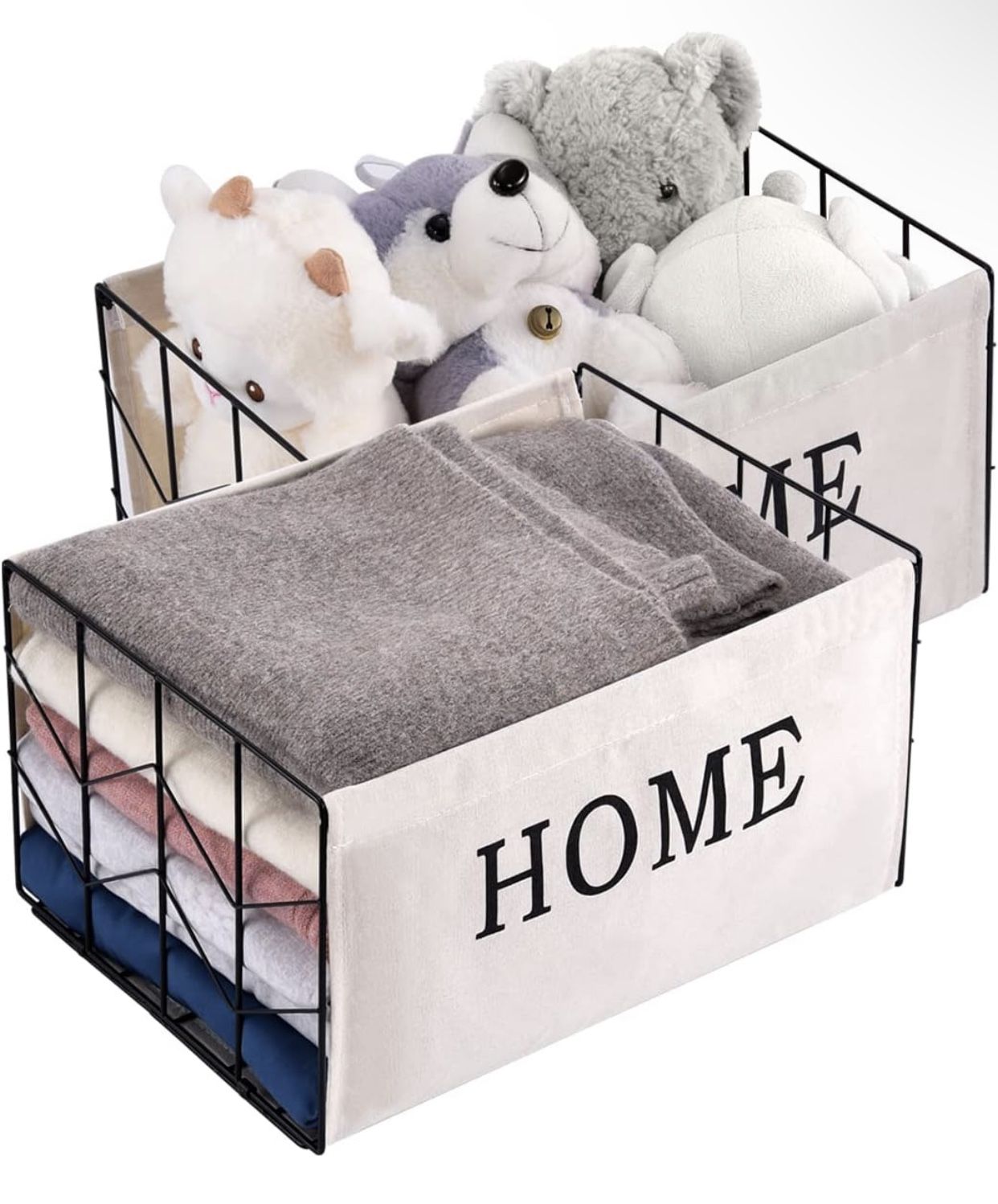 Closet Organizers and Storage, Storage Baskets 2-Pack Toy Organzier Storage Bins for Organizing, Detachable Bedroom Organizer, Sturdy Storage Bin with Metal Frame for Shelves, Cabinet, Closet, White Effortless Organization: This Storage Basket makes organizing your belongings a breeze. With their generous size of 11" (D) x 14.7" (W) x 8.3" (H), these baskets provide ample space for storing a wide range of items. They are larger than most baskets available on the market, allowing you to store more and keep your space tidy. Premium Material: This Storage Baskets are constructed with durable alloy steel, setting them apart from baskets with cardboard structures. This premium material ensures a sturdy and robust structure that can support up to 25 lbs of weight. Unlike flimsy alternatives, these storage baskets are built to last and provide long-lasting durability. Versatile and Stylish Storage: The Harnidipa Storage Baskets offer endless versatility, serving as closet storage bins, bedroom organizers, kids' toy baskets, towel holders, book/CD organizers, snacks/drinks boxes, and more. Their sleek design adds an elegant touch to your home while providing practical storage solutions. Space-Saving and Portable: This storage bin have a detachable design that allows for easy flattening, making them convenient to transport or store. Their compact size maximizes storage space, fitting perfectly on shelves, in cabinets, or closets, optimizing your available space