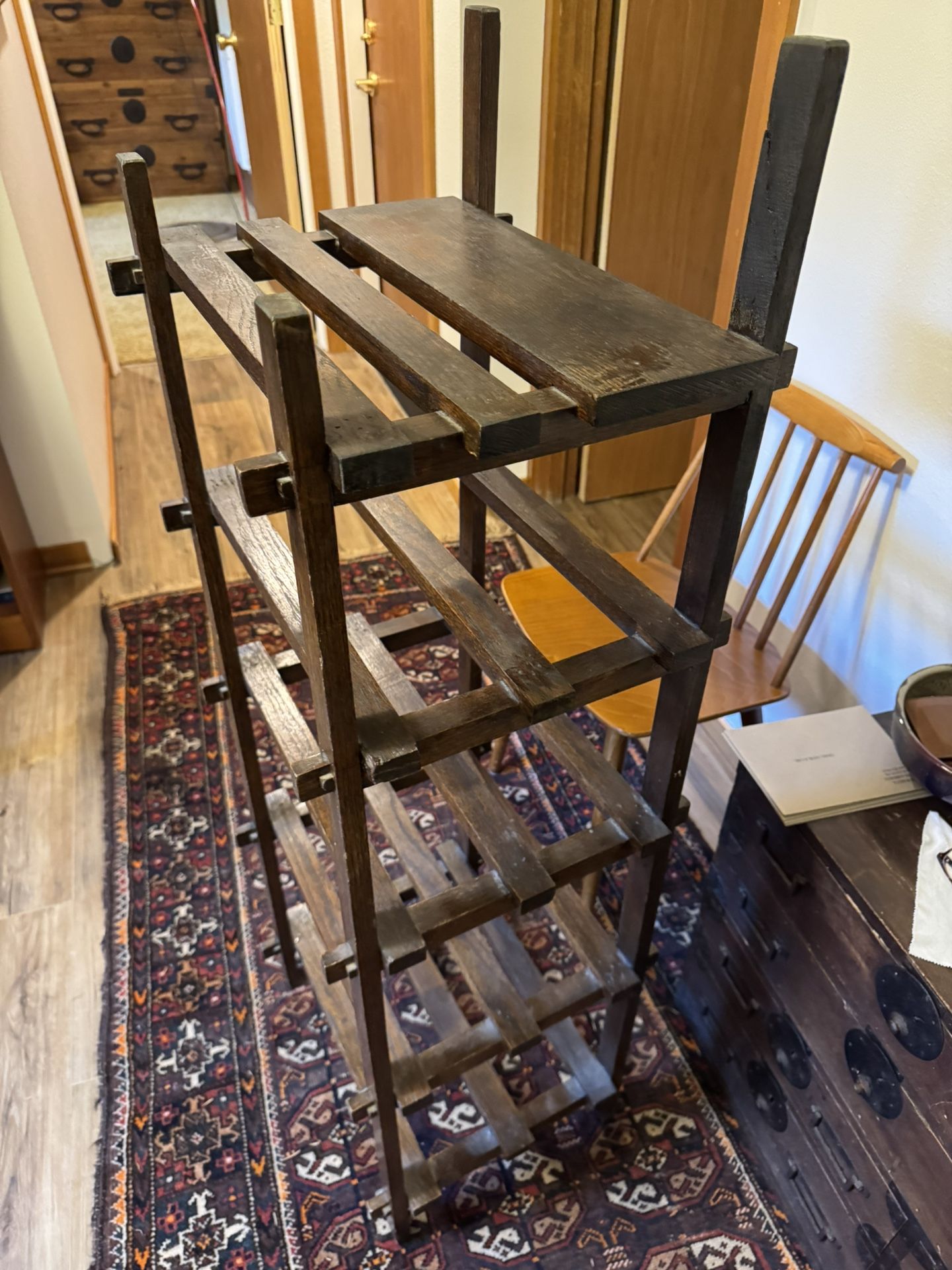 Arts and crafts/mission shelving unit in good condition and sturdy. 15.5” deep (shelves are 11.5” deep) 18.25” wide Top shelf is 43” tall Back part of unit is 49” tall 8.25” height between shelves