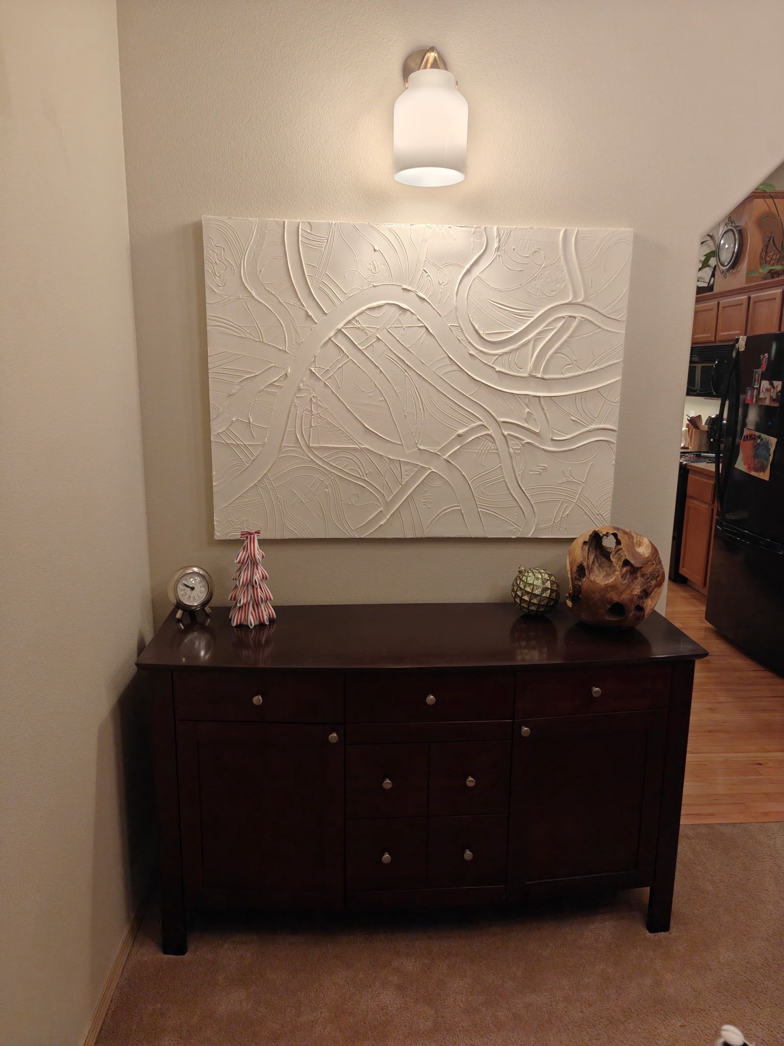 58"W x 34"H x 18.75"D Dark Cherry Few imperfections on the top but over all in good condition