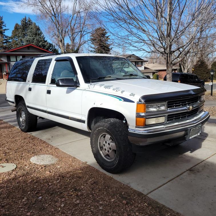 1995 Suburban with 3" lift and lots of other upgrades and recent repairs. Cold Air Intake with K&N Filter Replaced steering components, upper ball joints, control arms, outer and inner tie rods and adjusting sleeves, idler arm, premium disk brakes with rotors and calipers on front. CV axle assemblies replaced New windshield New radiator and radiator hoses Bilstein Silver Shock Absorbers New battery and battery tray Upgraded distributor, spark plugs, and wires. Distributer upgraded to MSD Performance. Brake fluids drained and replaced, lines bled. Windshield washer pump replaced, both front and rear washers functioning. Oil and lube service completed Replaced entire rear axle and drum brake assemblies, including limited slip differential. Exterior: no accidents, one area of rust behind right rear wheel. Some minor dings. Standard wear and tear. Interior: standard wear and tear. Original radio is included, but is out of holder. Tires need to be replaced. Current size is 285 75 16 Sold as is. Sale is final. Cash only. No trades. No exceptions. Thanks!