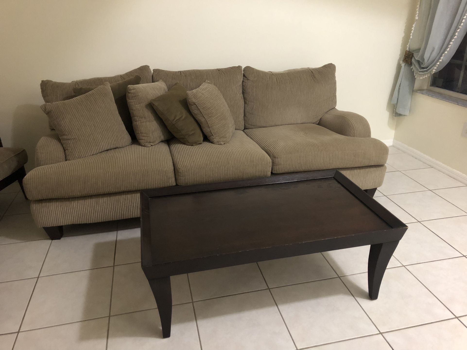 Couch w/ pillows, 2 chairs and 2 tables. Selling as a whole set