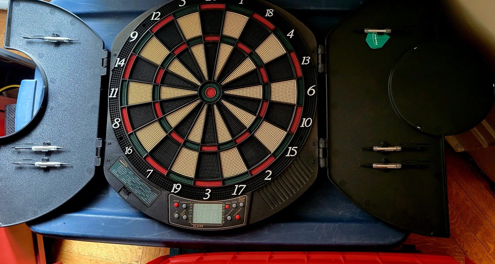 Features a 13.5-inch target area for soft-tip darts. Includes automatic electronic scoring and sound effects. Offers a variety of pre-programmed game variations (some models have up to 65). Designed to be lightweight and portable, often powered by batteries for cordless use. Integrated dart holders are located in the side cabinets.