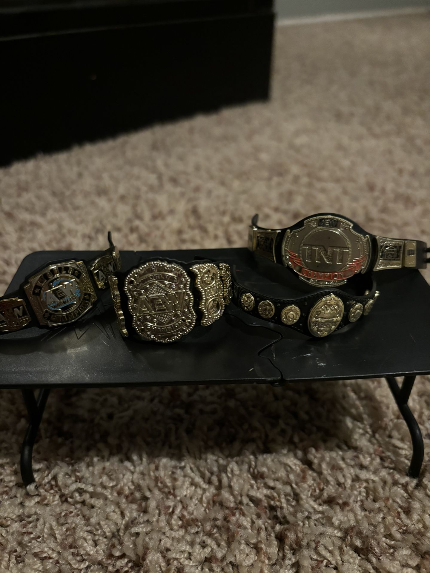 AEW Figure Belt Lot Comes with AEW World, womens, tag team(Has two tag titles just missing in picture) and TNT title Pickup only!!