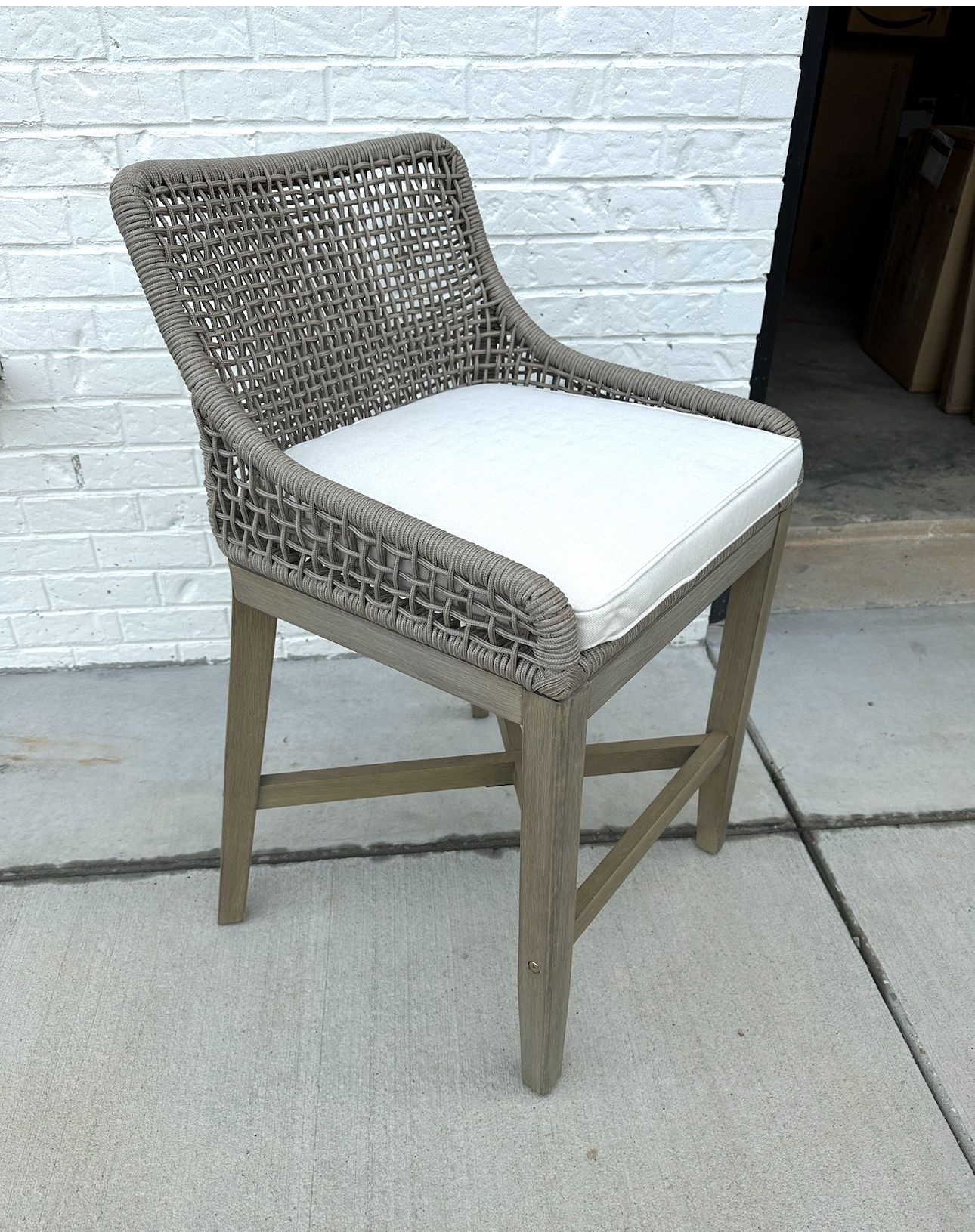 NEW, never used indoor/outdoor counter height stools with canvas cushions. Very comfortable. One is assembled. See photos for dimensions. $60 each or $300 for all 6