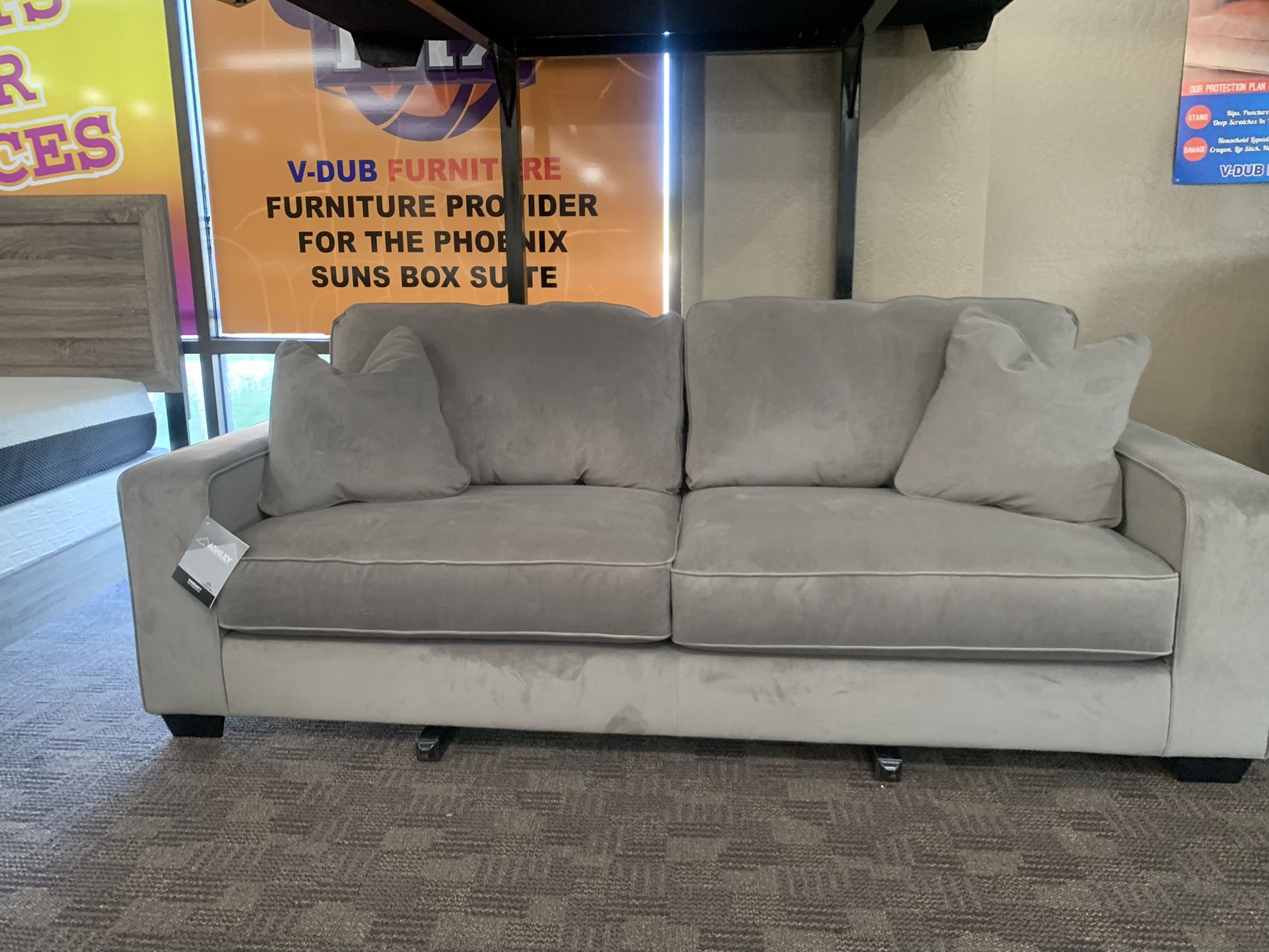 Brand new sofa and love seat set. Attached back pillows, soft grey fabric, accent pillows. Comfortable seating. Delivery and financing available