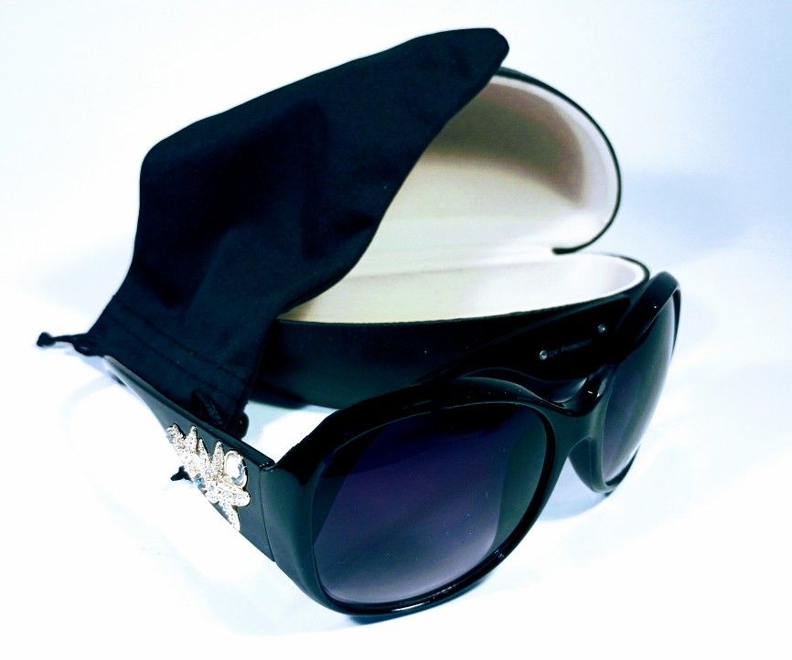 Lady's oversized butterfly sunglasses with black frame with starfish embellishments and black polycarbonate lenses. A black hard shell sunglass case and microfiber bag included for protection and cleaning.