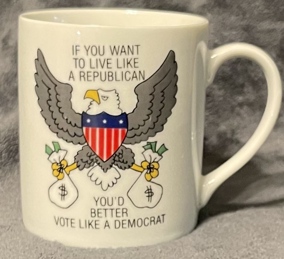 Vintage “If You Want To Live Like A Republican You’d Better Vote Like A Democrat” Omnibus Porcelain Coffee Mug. If you are a Democrat this is the mug for you. I do not usually sell political items, but when I saw this I knew someone would love it. It features the saying noted above with an eagle holding money bags on the front and an eagle amongst spilled money bags on the back. It is porcelain and is a high quality piece. It has a nice balanced weight. Made in Japan. Height 3.5 in Depth 3.25 in Diameter 3 in Weight 11 oz In excellent like new vintage condition. There are no chips, cracks, or crazing. Please review the photos for verification of condition. Photos are considered part of the description. From a NON-SMOKING home.