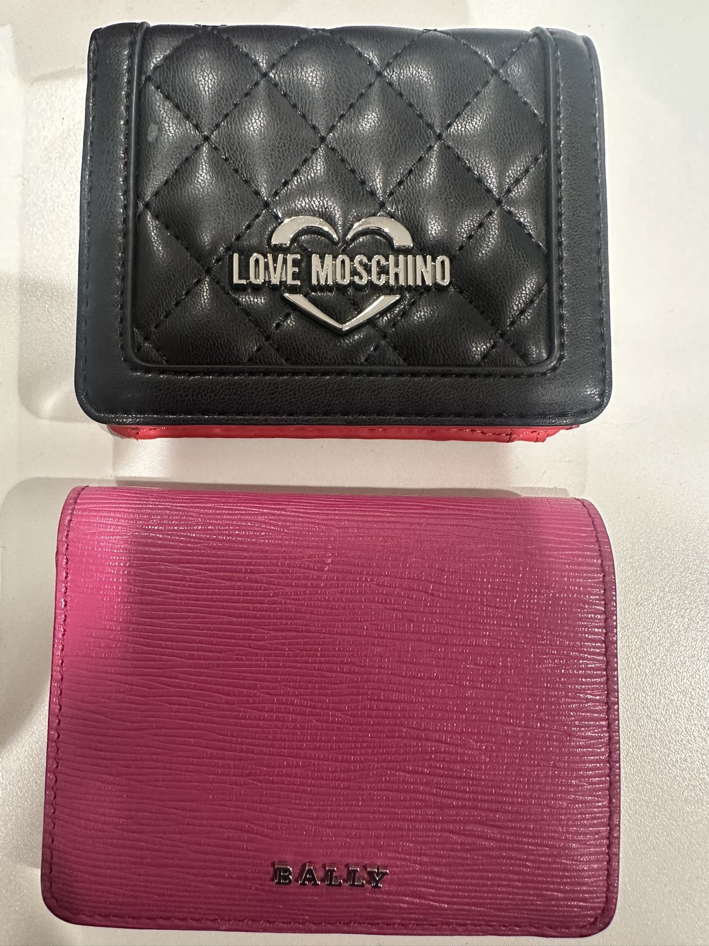 Used Bally and Moschino Set Love Moschino black wallet with red trim (Has small scuff as pictured) 4 card slots 1 coin pocket 1 bill pocket Still in good condition Pink Bally Wallet Has 5 credit card slots 1 slot holds multiple cards 1 bill pocket Still in great condition Wallets come with original boxes and authenticity cards