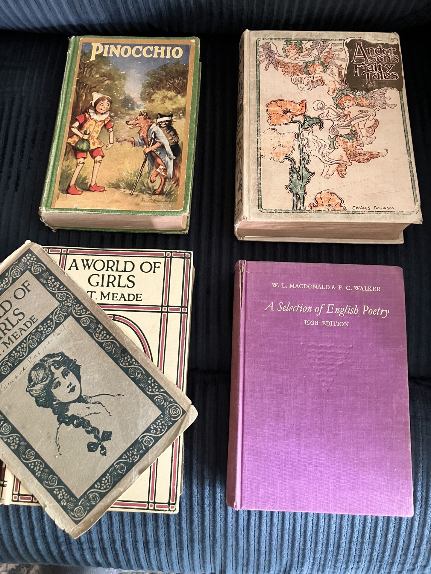 BEST OFFER WILL TAKE THESE 1924 Edition Pinocchio Carlo Collodi 1926 Andersen’s Fairy Tales published by JM Dent London 1927 A World of Girls LT Meade the cover is falling apart Hard cover is good 1938 A Selection of English Poetry