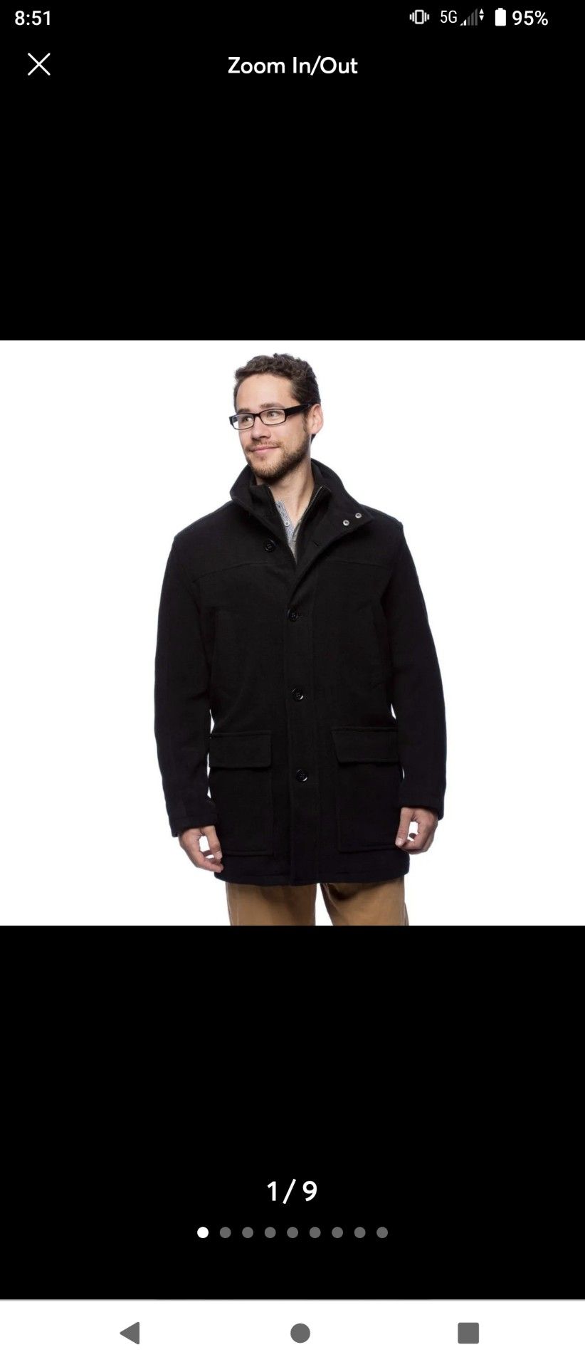 NEW Attached bib for additional warmth Knit collar trim Multifunctional pockets Shell: 60% Wool, 35% polyester, 5% Other Fibers Pockets: Two (2) Front Pockets, Two (2) Four-Front Pockets, One (1) inside Zipper Pocket. Collar: Stand up Lining: Fully lined Closure: Zipper/ button Color blk Black ***** LAID FLAT MEASUREMENTS ***** PIT TO PIT / 22 INCHES SHOULDER TO SHOULDER / 19 INCHES FROM SHOULDER TO THE END OF THE COAT / 33 INCHES SLEEVE LENGTH / 25 INCHES