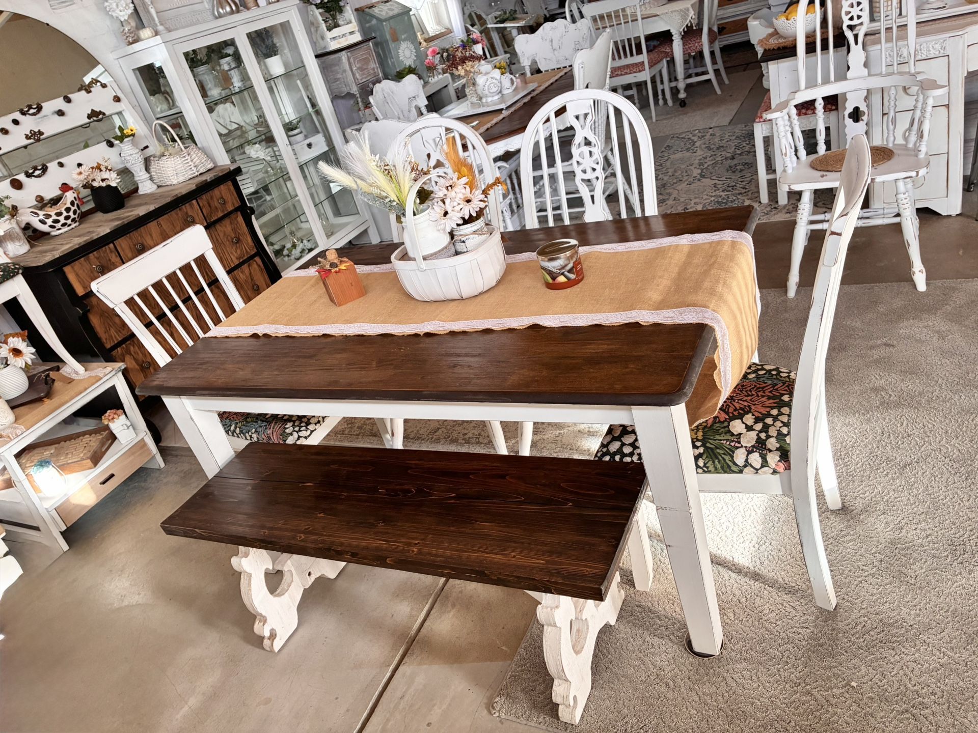An ultra shabby / rustic kitchen table measuring 3’ x 5’ and includes 4 mis-matched chairs and a very lightweight bench Located in Very East Rural Parker *** Spring’n Creations LLC ***