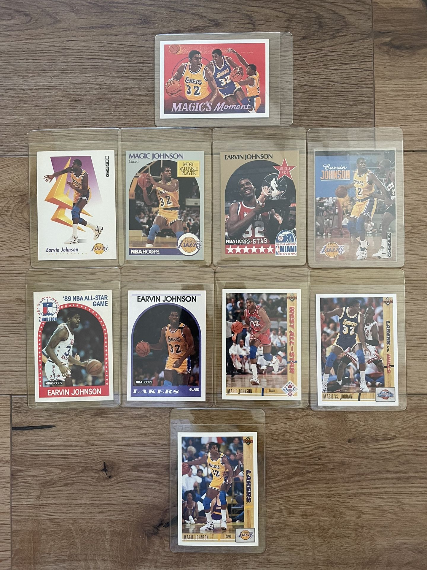 10 Magic Johnson cards in protective sleeves.