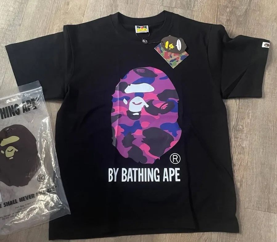 Authentic BAPE (A Bathing Ape) black T-shirt Purple/Pink camo Ape Head logo on front Brand new with tags & original packaging Great condition – never worn Comfortable cotton material Perfect for streetwear outfits Comes in a size small