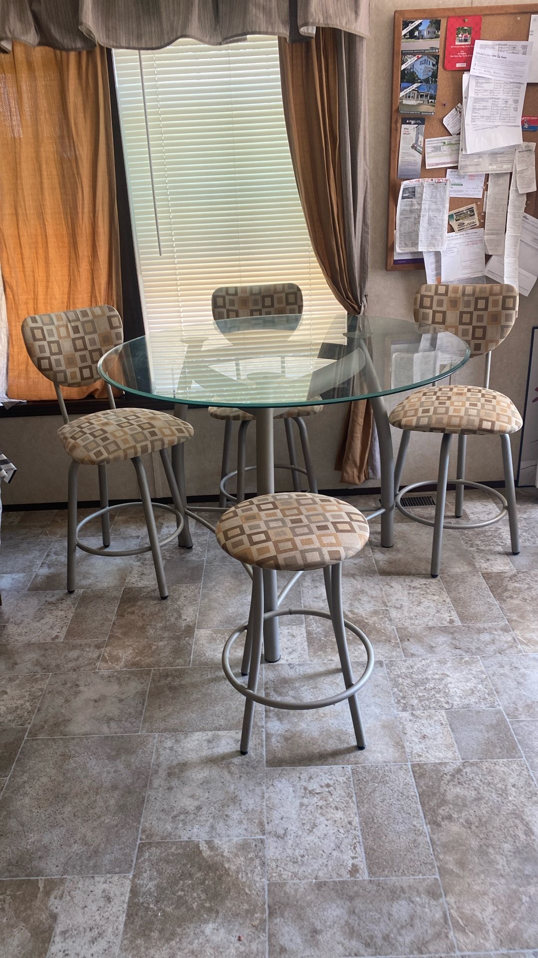 48 inch round - high glass table. Table is 39 inches high… Retro pattern on chairs… Has some wear & tear on the glass. Super sturdy. 3 sturdy chairs plus 1 stool, looking to sell immediately… make me an offer