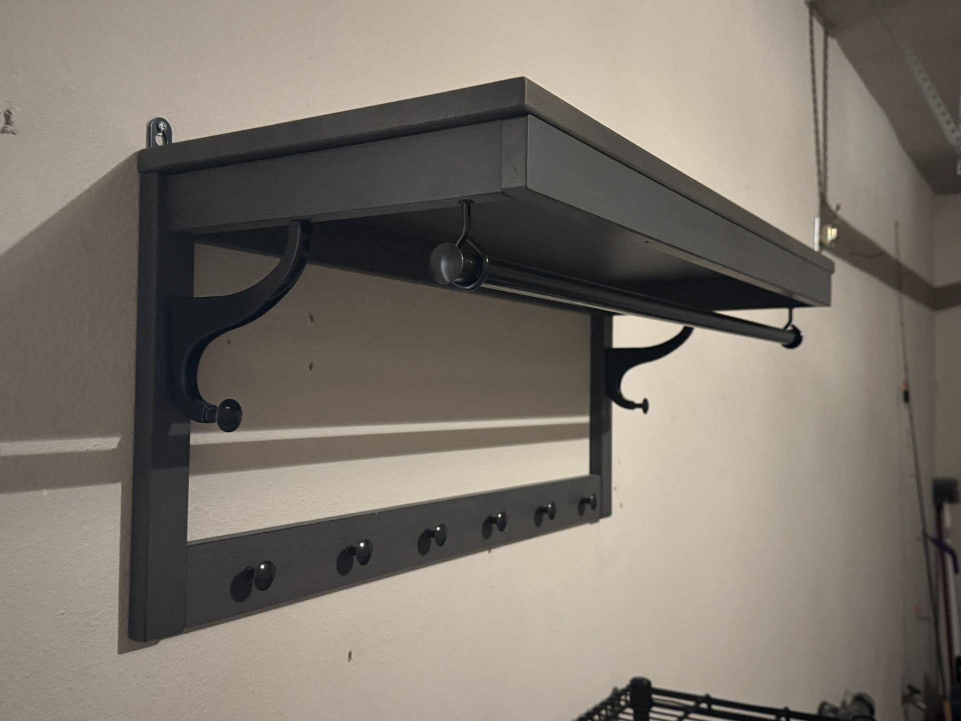Streamline your entryway or mudroom with this multi-functional wall shelf. The integrated top shelf provides space for decor, bags, or baskets, while the lower hooks and hanging rod deliver practical storage for coats, scarves, backpacks, and umbrellas. The matte charcoal finish and metal brackets offer a modern aesthetic that fits with contemporary, industrial, or farmhouse interiors. • Top shelf for storage or display • Six hooks for jackets and bags • Hanging rod for scarves or hangers • Sturdy metal brackets and wood frame • Neutral grey finish for broad design compatibility • Mounts directly to wall Approx. width: 30 to 36 inches.