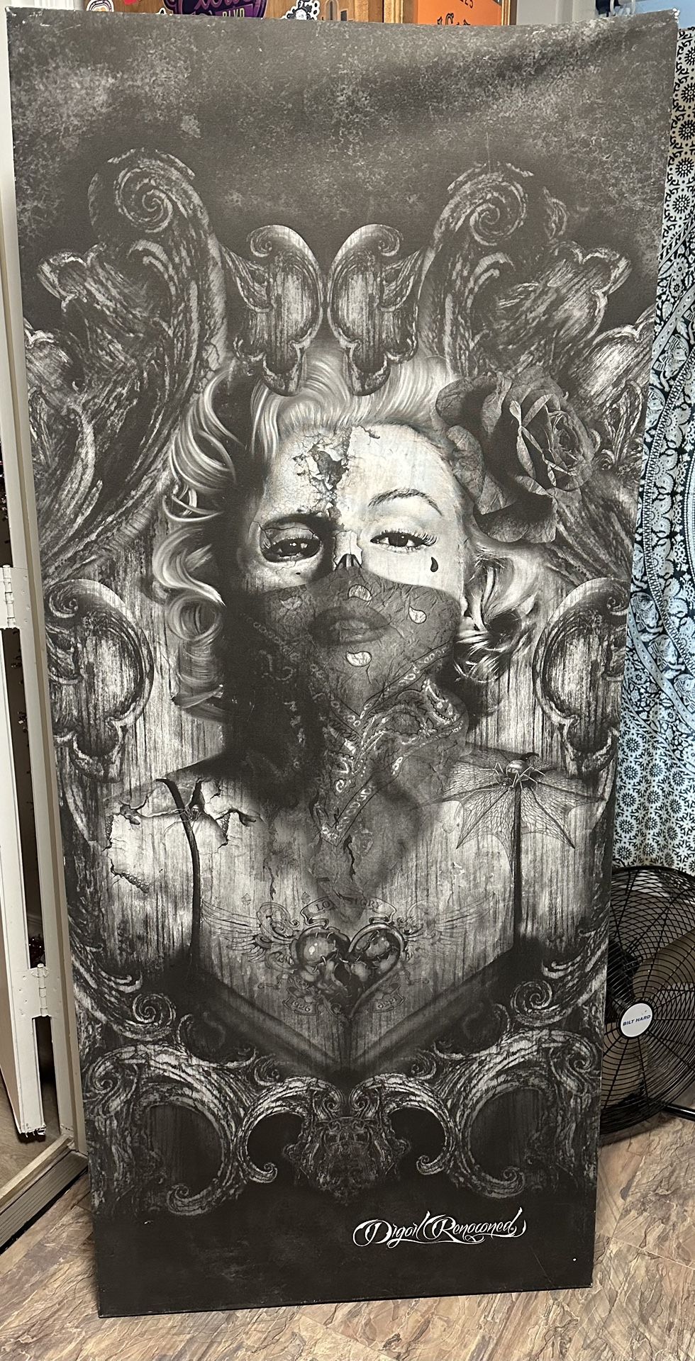 31.5x72.5 framed canvas picture of a decaying Marilyn Monroe. The frame is cracked around the top, but has been hung in the past this way. Cool for an art project