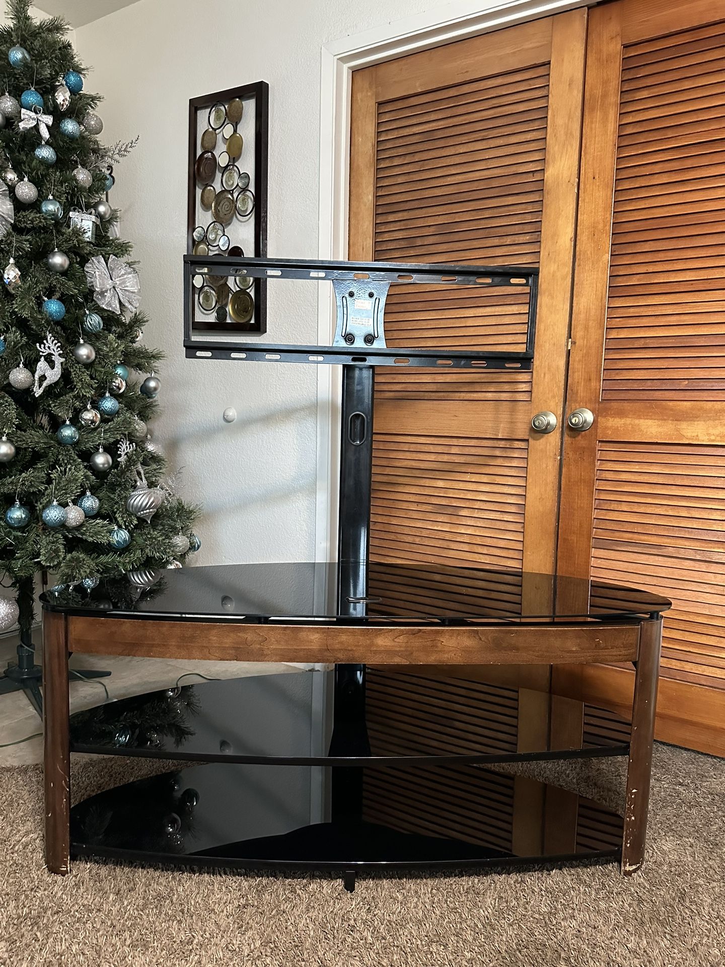 TV Stand 50in A Lil Scratch up but overall good condition It has a mount that you can unscrew if you would like since it is missing parts or you can replace the mount and mount your TV. NEED GONE - NEEDS TO BE PICKED UP