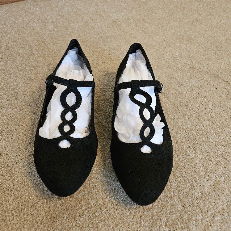 New, no box. TORRID ALMOND TOE FLATS WITH FANCY FRONT STRAP. Women's size 9W. Faux suede. Black. Cash only.