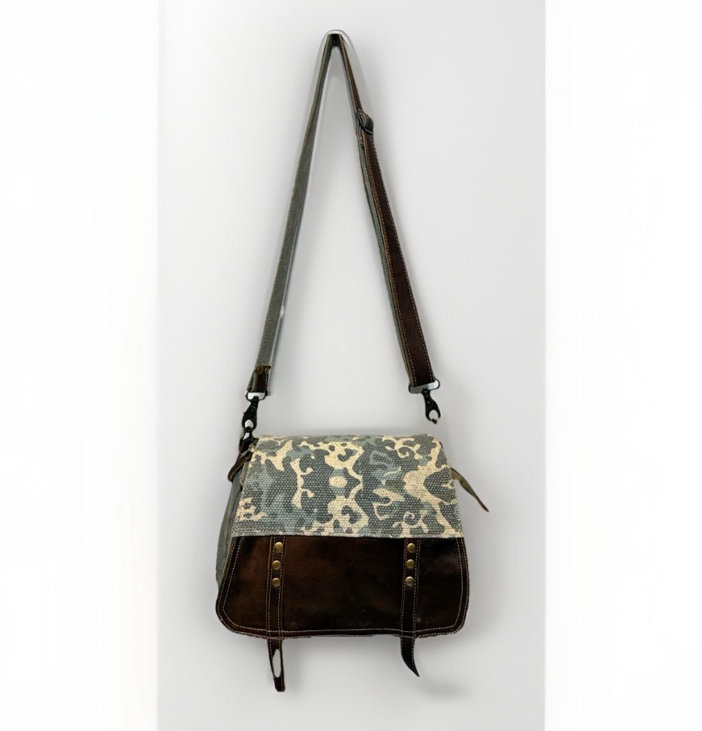 Bag is in good condition. Inner lining has come yellowing and some mild stains near the top. I found a few other spots I put in photos one on strap like 3 rust dots and something under the flap like a watermark or something. Looks good anyway but check the pictures well as it not a new bag. TY Nice bag with camouflage pattern. Messenger bag style. Made with upcycled canvas and genuine leather. Detachable and adjustable crossbody strap. Magnetic snap closure on flap. Main compartment is zip closure. 1 zip and 2 inner slip pockets. Zip pocket on backside, too. Strap is both leather and canvas. Copper color hardware. Inner lining is white with logo. Medium size bag about 12”w x 10.5”h x 4”d I am AliciA if you have any questions, please message me. We are G&A Accessories. I strive to have excellent customer satisfaction. Please check my reviews . TY